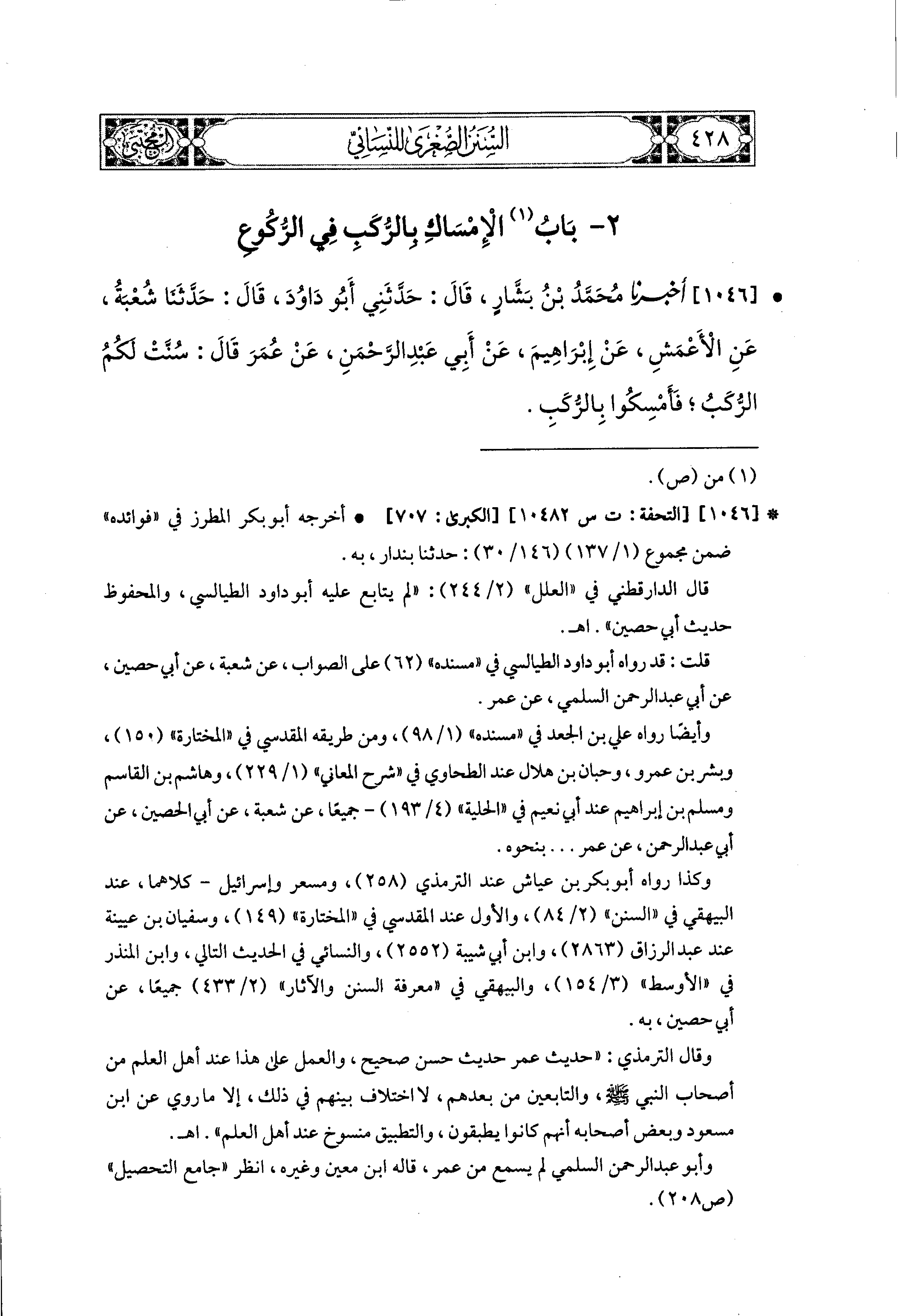 1046- أَخبَرنا مُحَمد بنُ بَشَّارٍ، قَالَ: حَدَّثَني أَبو دَاوُدَ، قال: حَدثنا شُعبَةُ، عَنِ الأَعْمَشِ، عَن إِبراهِيمَ، عَن أَبي عَبدِ الرَّحْمَنِ، عَن عُمَرَ قَالَ: سُنَّتْ لَكُمُ الرُّكَبُ، فَأَمْسِكُوا بِالرُّكَبِ.