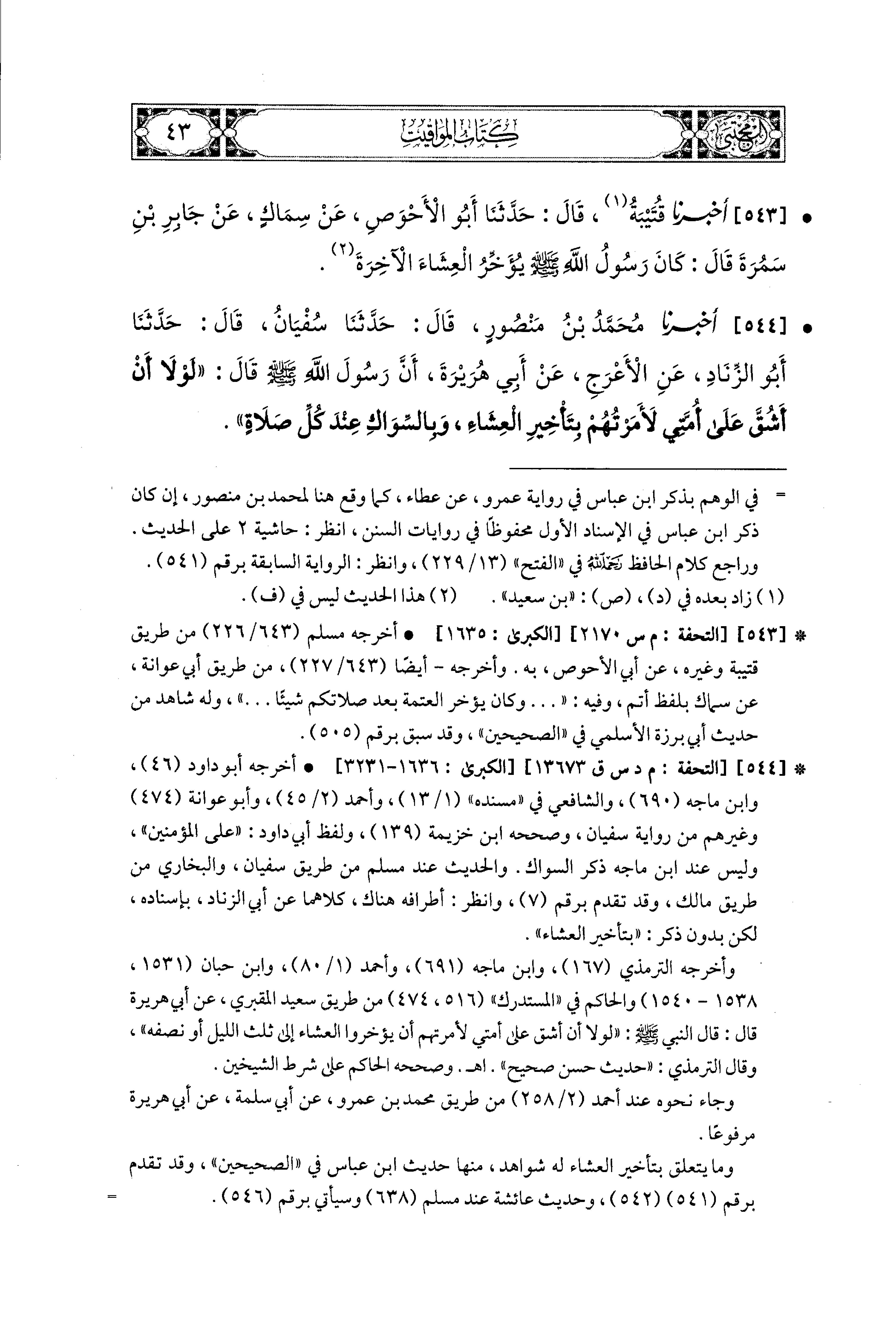 544- أَخبَرنا مُحَمد بنُ مَنْصُورٍ، قال: حَدثنا سُفيَانُ، قال: حَدثنا أَبو الزِّنَادِ، عَنِ الأَعْرَجِ، عَن أَبي هُرَيْرَةَ، أَنَّ رَسُولَ اللهِ صَلى الله عَليه وسَلم قَالَ: لَوْلاَ أَنْ أَشُقَّ عَلَى أُمَّتِي لأَمَرْتُهُمْ بِتَأْخِيرِ العِشَاءِ وبالسواك عِنْدَ كُلِّ صَلاَةٍ.