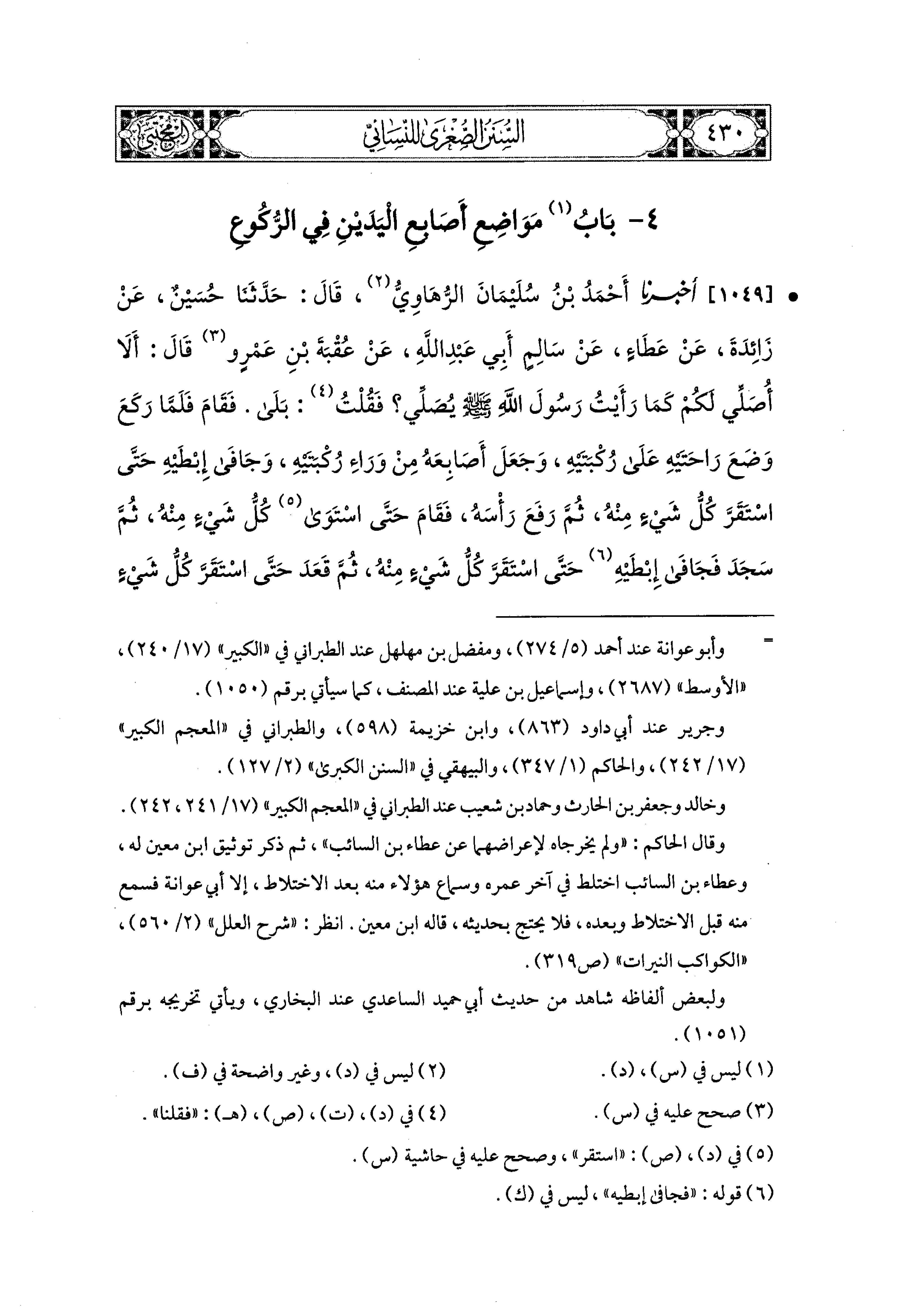 1049- أَخبَرنا أَحْمَدُ بنُ سُلَيمَانَ الرُّهَاوِيُّ، قال: حَدثنا حُسَيْنٌ، عَن زَائِدَةَ، عَن عَطَاءٍ، عَن سَالِمٍ أَبي عَبدِ اللهِ، عَن عُقْبَةَ بْنِ عَمْرٍو قَالَ: أَلاَ أُصَلِّي لَكُمْ كَمَا رَأَيْتُ رَسُولَ اللهِ صَلى الله عَليه وسَلم يُصَلِّي؟ فَقُلْت: بَلَى، فَقَامَ فَلَمَّا رَكَعَ وَضَعَ رَاحَتَيْهِ عَلَى رُكْبَتَيْهِ، وَجَعَلَ أَصَابِعَهُ مِنْ وَرَاءِ رُكْبَتَيْهِ، وَجَافَى إِبْطَيْهِ حَتَّى اسْتَقَرَّ كُلُّ شَيْءٍ مِنْهُ، ثُمَّ رَفَعَ رَأْسَهُ فَقَامَ حَتَّى اسْتَوَى كُلُّ شَيْءٍ مِنْهُ، ثُمَّ سَجَدَ فَجَافَى إِبْطَيْهِ حَتَّى اسْتَقَرَّ كُلُّ شَيْءٍ مِنْهُ، ثُمَّ قَعَدَ حَتَّى اسْتَقَرَّ كُلُّ شَيْءٍ مِنْهُ، ثُمَّ سَجَدَ حَتَّى اسْتَقَرَّ كُلُّ شَيْءٍ مِنْهُ، ثُمَّ صَنَعَ كَذَلِكَ أَرْبَعَ رَكَعَاتٍ، ثُمَّ قَالَ: هَكَذَا رَأَيْتُ رَسُولَ اللهِ صَلى الله عَليه وسَلم يُصَلِّي، وَهَكَذَا كَانَ يُصَلِّي بِنَا.