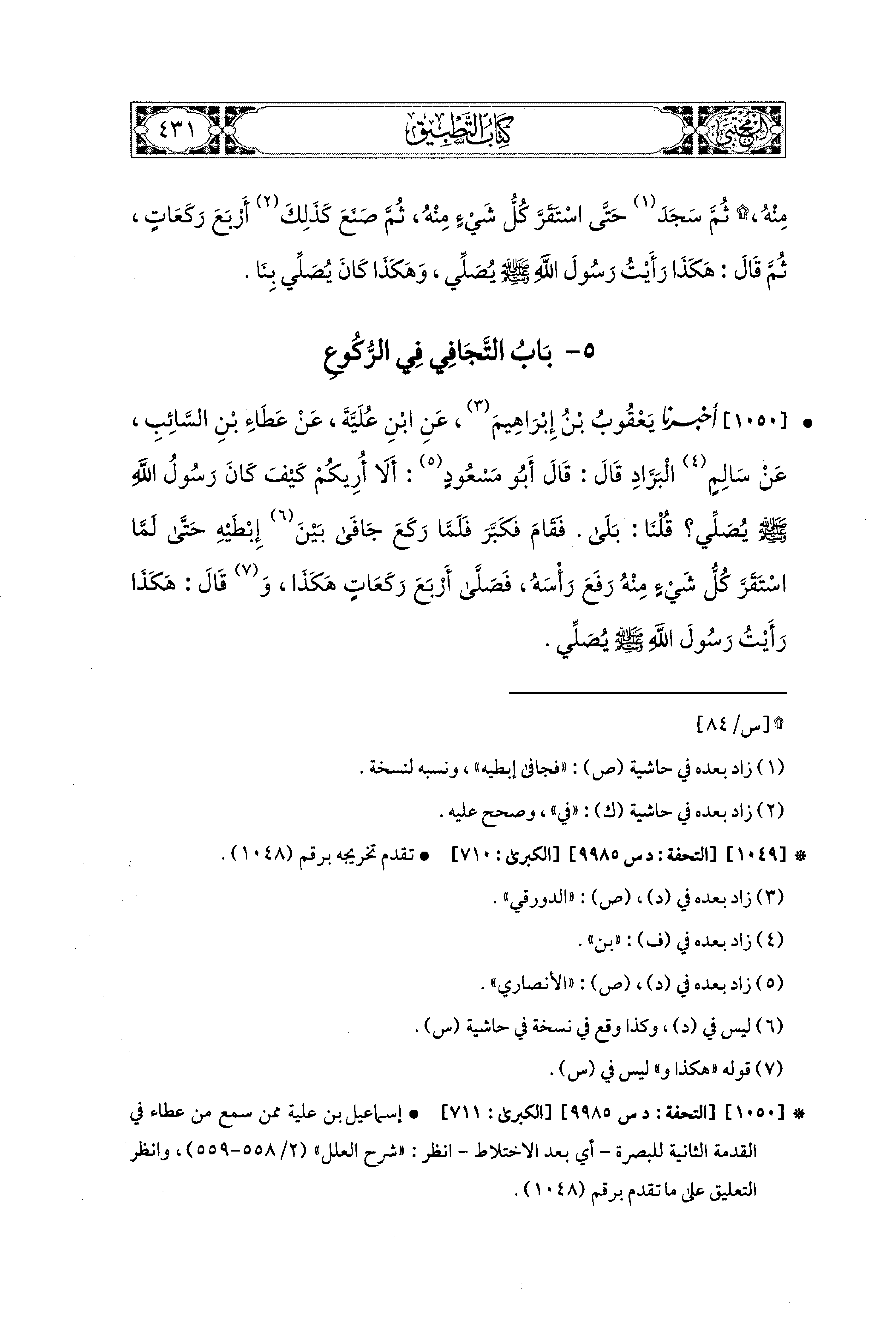 1050- أَخبَرنا يَعقُوبُ بنُ إِبراهِيمَ، عَنِ ابنِ عُلَيَّةَ، عَن عَطَاءِ بْنِ السَّائِبِ، عَن سَالِمٍ البَرَّادِ، قَالَ: قَالَ أَبو مَسْعُودٍ: أَلاَ أُرِيكُمْ كَيْفَ كَانَ رَسُولُ اللهِ صَلى الله عَليه وسَلم يُصَلِّي؟ قُلْنَا: بَلَى، فَقَامَ فَكَبَّرَ، فَلَمَّا رَكَعَ جَافَى بَيْنَ إِبْطَيْهِ، حَتَّى لَمَّا اسْتَقَرَّ كُلُّ شَيْءٍ مِنْهُ، رَفَعَ رَأْسَهُ فَصَلَّى أَرْبَعَ رَكَعَاتٍ هَكَذَا، وَقَالَ: هَكَذَا رَأَيْتُ رَسُولَ اللهِ صَلى الله عَليه وسَلم يُصَلِّي.