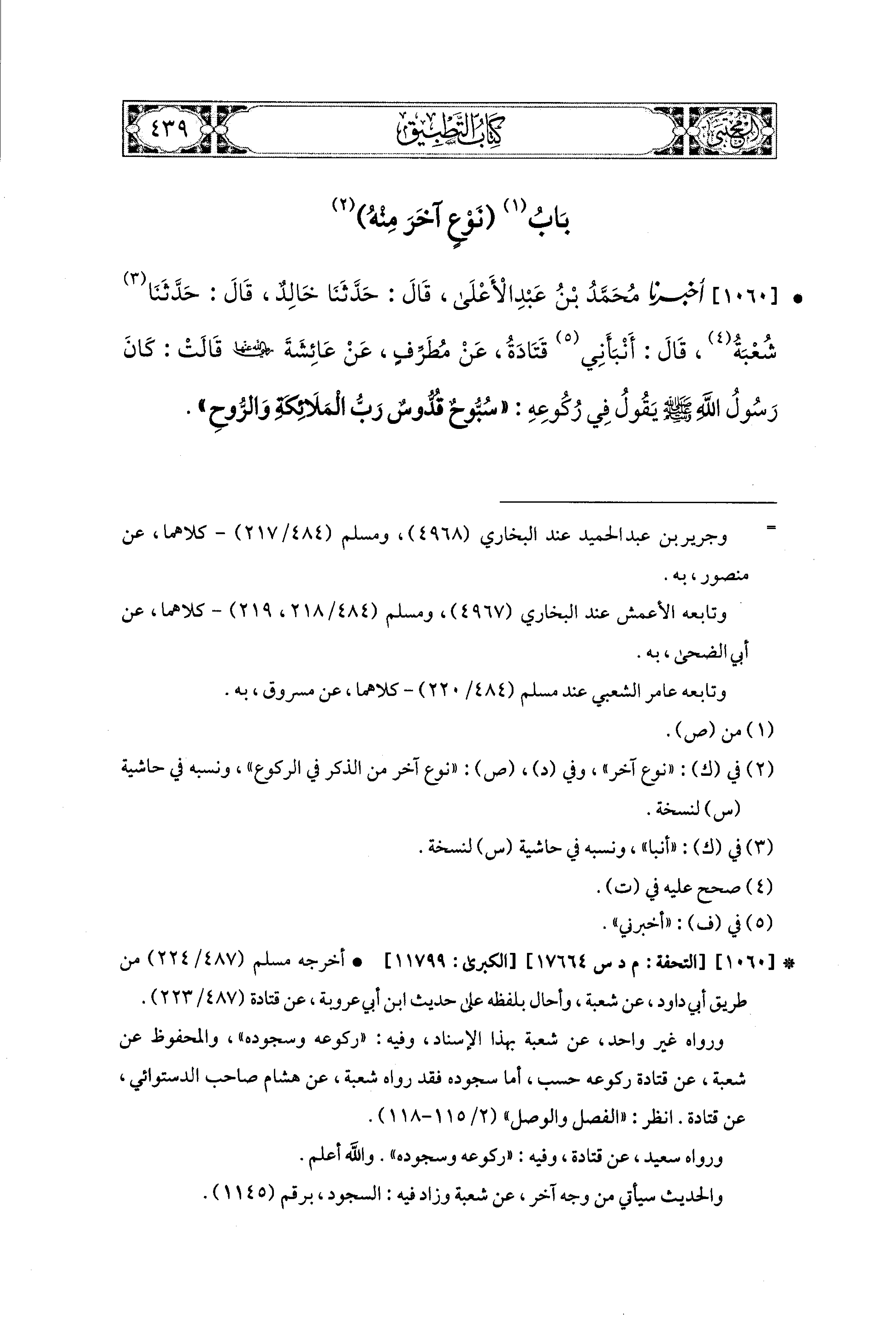 1060- أَخبَرنا مُحَمد بن عَبدِ الأَعلَى، قال: حَدثنا خَالِدٌ، قال: حَدثنا شُعبَةُ، قَالَ: أَنْبَأَني قَتَادَةُ، عَن مُطَرِّفٍ، عَن عَائِشَةَ رَضِيَ اللهُ عَنهَا قَالَتْ: كَانَ رَسُولُ اللهِ صَلى الله عَليه وسَلم يَقُولُ فِي رُكُوعِهِ: سُبُّوحٌ قُدُّوسٌ رَبُّ المَلاَئِكَةِ وَالرُّوحِ.