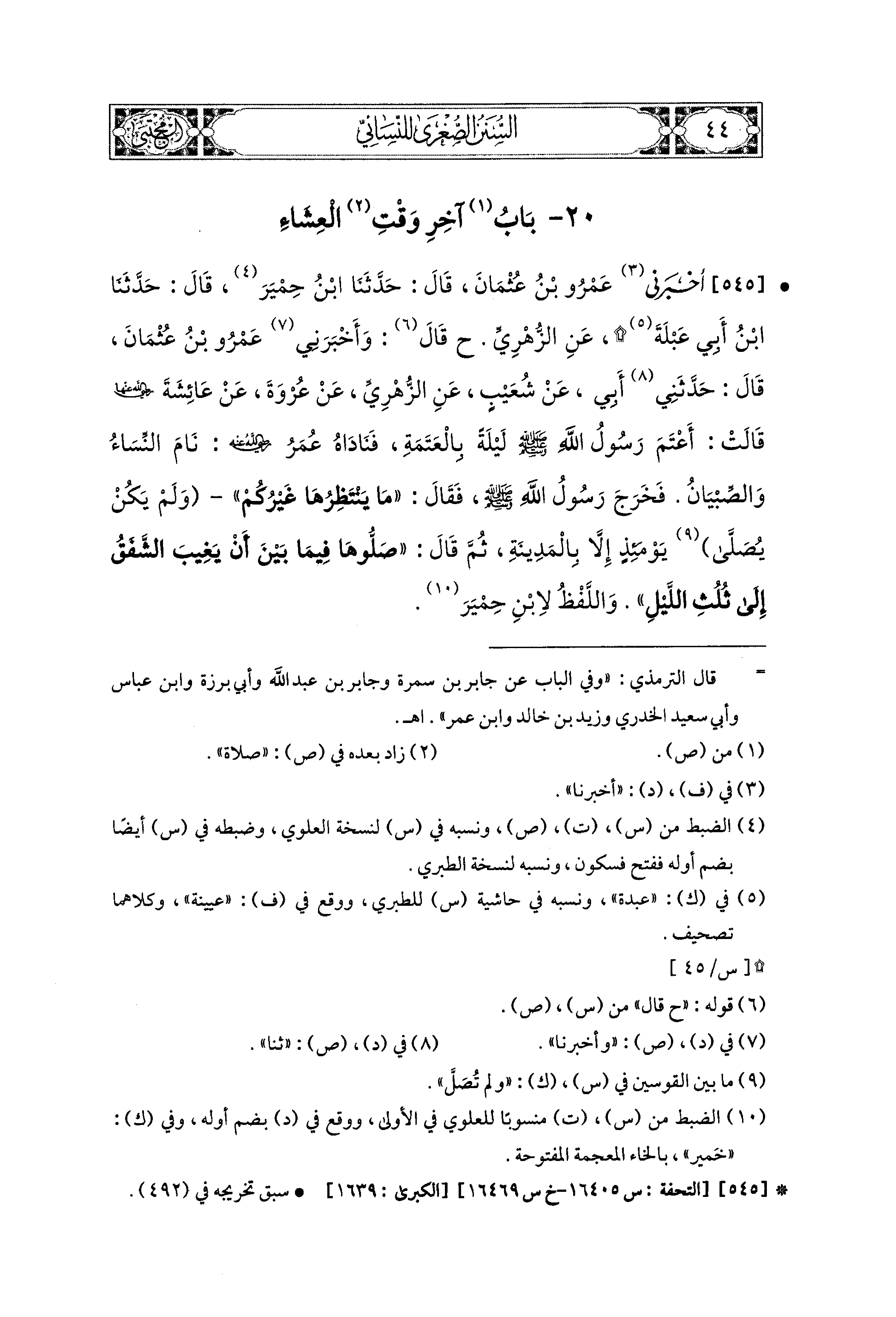 545- أَخبَرني عَمْرُو بنُ عُثمَانَ، قال: حَدثنا ابنُ حِمْيَرٍ، قال: حَدثنا ابنُ أَبي عَبْلَةَ، عَنِ الزُّهْرِيِّ (ح)، قال: وَأَخبَرني عَمْرُو بنُ عُثمَانَ، قَالَ: حَدَّثَني أَبي، عَن شُعَيبٍ، عَنِ الزُّهْرِيِّ، عَن عُرْوَةَ، عَن عَائِشَةَ قَالَتْ: أَعْتَمَ رَسُولُ اللهِ صَلى الله عَليه وسَلم لَيْلَةً بِالعَتَمَةِ، فَنَادَاهُ عُمَرُ رَضِيَ اللهُ عَنهُ نَامَ النِّسَاءُ وَالصِّبْيَانُ، فَخَرَجَ رَسُولُ اللهِ صَلى الله عَليه وسَلم فَقَالَ: مَا يَنْتَظِرُهَا غَيْرُكُمْ، وَلَمْ يَكُنْ يُصَلِّي يَوْمَئِذٍ إِلاَّ بِالمَدِينَةِ، ثُمَّ قَالَ: صَلُّوهَا فِيمَا بَيْنَ أَنْ يَغِيبَ الشَّفَقُ إِلَى ثُلُثِ اللَّيلِ وَاللَّفْظُ لاِبْنِ حِمْيَرٍ.