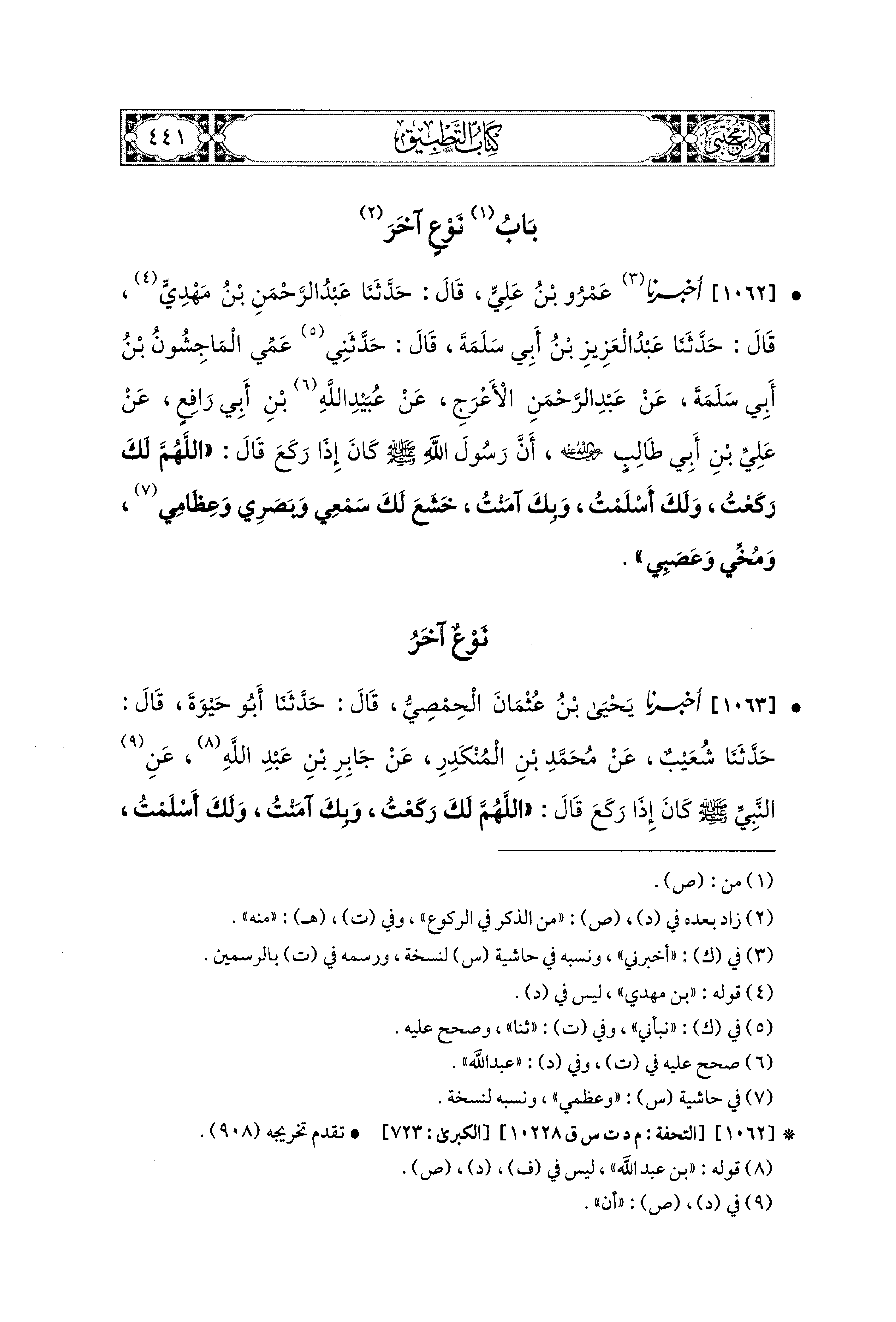 1062- أَخبَرنا عَمْرُو بنُ عَلِيٍّ، قال: حَدثنا عَبدُ الرَّحْمَنِ بنُ مَهْدِيٍّ، قال: حَدثنا عَبدُ العَزِيزِ بنُ أَبي سَلَمَةَ، قال: حَدَّثني عَمِّي المَاجِشُونُ بنُ أَبي سَلَمَةَ، عَن عَبدِ الرَّحْمَنِ الأَعْرَجِ، عَن عُبَيدِ اللهِ بْنِ أَبي رَافِعٍ، عَن عَلِيِّ بْنِ أَبي طَالِبٍ رَضِيَ اللهُ عَنهُ، أَنَّ رَسُول الله صَلى الله عَليه وسَلم كَانَ إِذَا رَكَعَ قَالَ: اللهُمَّ لَكَ رَكَعْتُ، وَلَكَ أَسْلَمْتُ، وَبِكَ آمَنْتُ، خَشَعَ لَكَ سَمْعِي وَبَصَرِي وَعِظَامِي وَمُخِّي وَعَصَبِي.