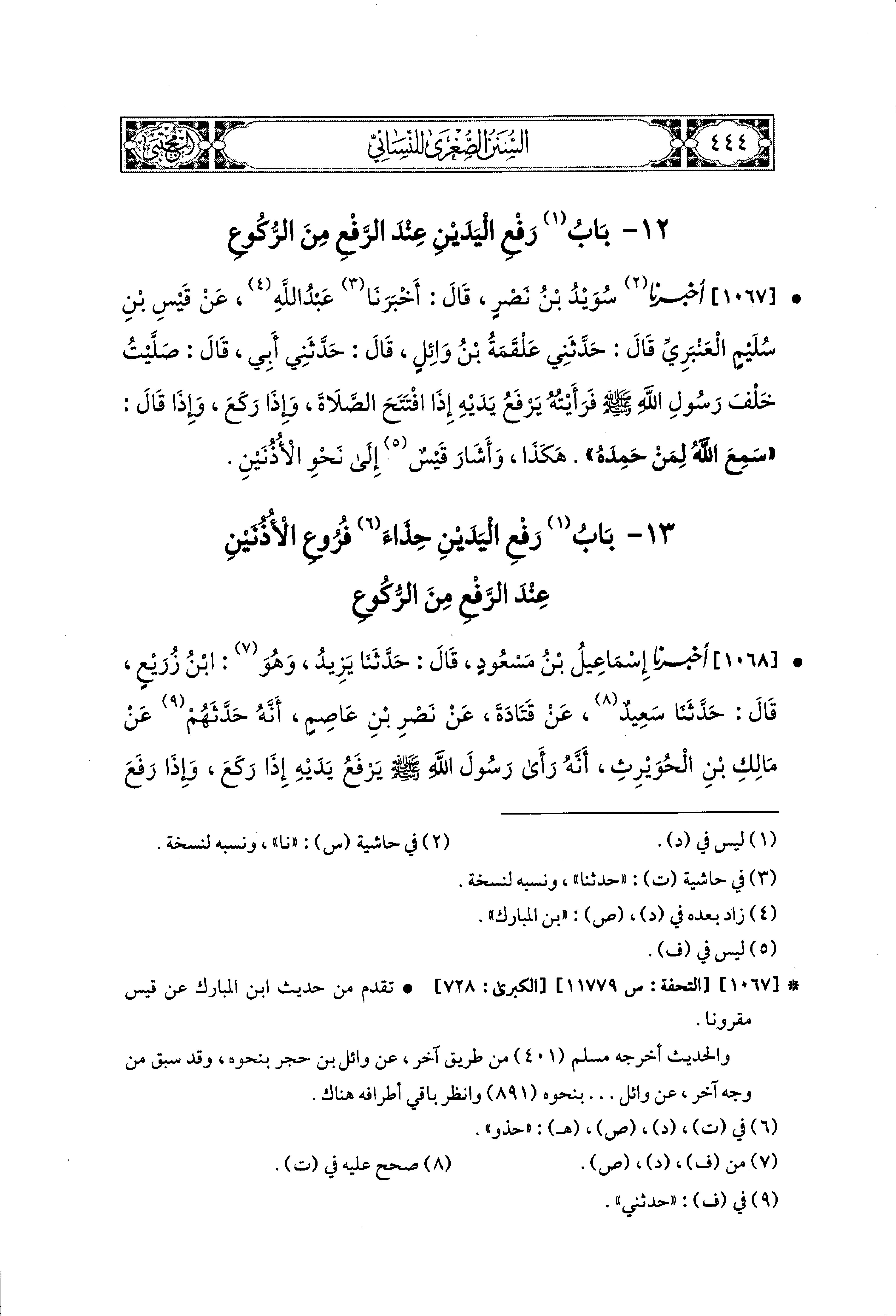 1068- أَخبَرنا إِسماعِيلُ بنُ مَسْعُودٍ، قال: حَدثنا يَزِيدُ، وَهُوَ ابنُ زُرَيْعٍ، قال: حَدثنا سَعيدٌ، عَن قَتَادَةَ، عَن نَصْرِ بْنِ عَاصِمٍ أَنَّهُ حَدَّثَهُمْ، عَن مَالِكِ بْنِ الحُوَيْرِثِ، أَنَّهُ رَأَى رَسُولَ اللهِ صَلى الله عَليه وسَلم يَرْفَعُ يَدَيْهِ إِذَا رَكَعَ، وَإِذَا رَفَعَ رَأْسَهُ مِنَ الرُّكُوعِ حَتَّى يُحَاذِيَ بِهِمَا فُرُوعَ أُذُنَيْهِ.