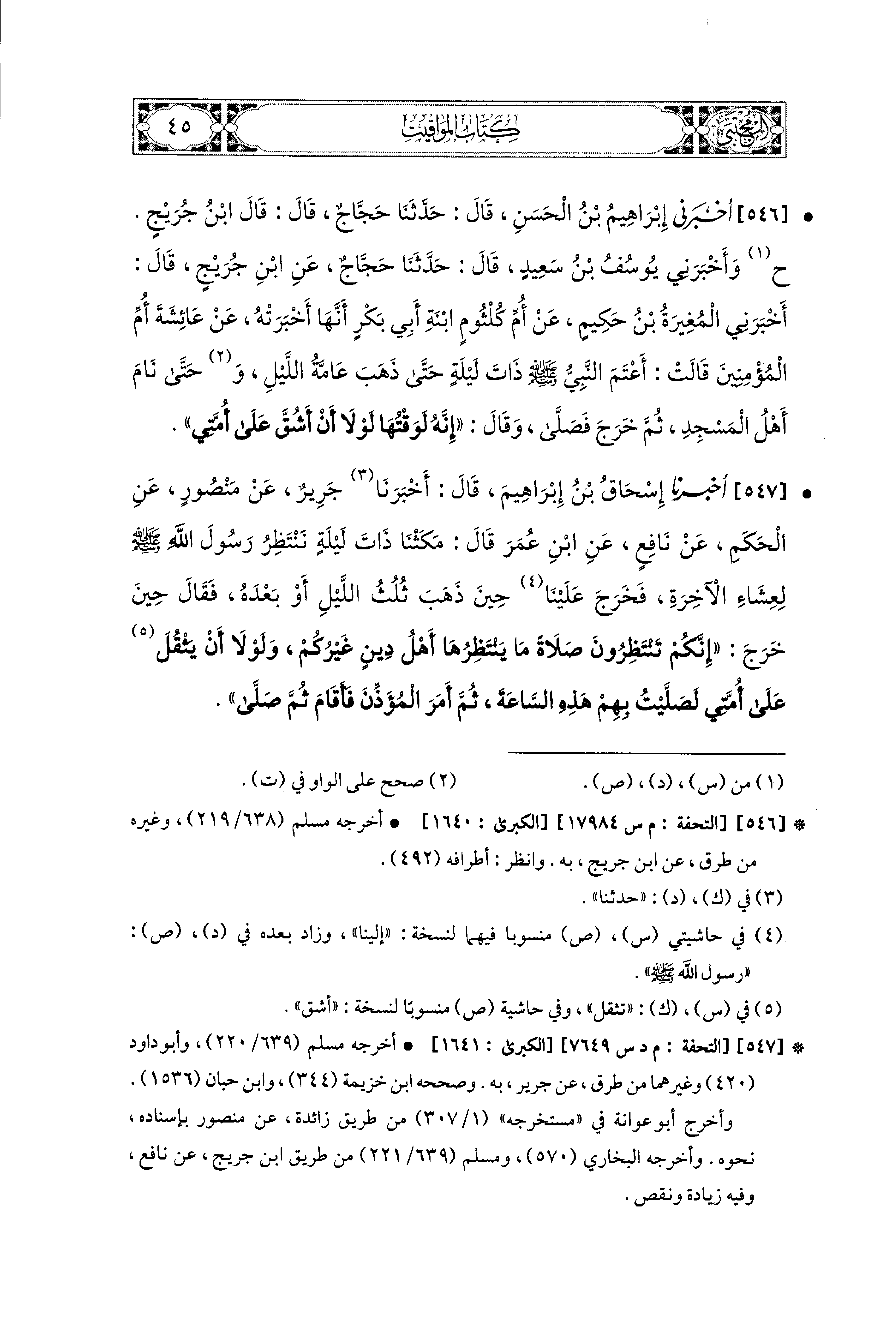 546- أَخبَرني إِبراهِيمُ بنُ الحَسَنِ، قال: حَدثنا حَجَّاجٌ قَالَ: قَالَ ابنُ جُرَيْجٍ، (ح) وأَخبَرني يُوسُفُ بنُ سَعيدٍ، قال: حَدثنا حَجَّاجٌ، عَنِ ابنِ جُرَيْجٍ، قَالَ: أَخبَرني المُغِيرَةُ بنُ حَكِيمٍ، عَن أُمِّ كُلْثُومِ ابنَةِ أَبي بَكْرٍ أَنَّهَا أَخْبَرَتْهُ، عَن عَائِشَةَ أُمِّ المُؤْمِنينَ قَالَتْ: أَعْتَمَ النَّبيُّ صَلى الله عَليه وسَلم ذَاتَ لَيْلَةٍ حَتَّى ذَهَبَ عَامَّةُ اللَّيلِ، وَحَتَّى نَامَ أَهْلُ المَسْجِدِ، ثُمَّ خَرَجَ فَصَلَّى، وَقَالَ: إِنَّهُ لَوَقْتُهَا لَوْلاَ أَنْ أَشُقَّ عَلَى أُمَّتِي.