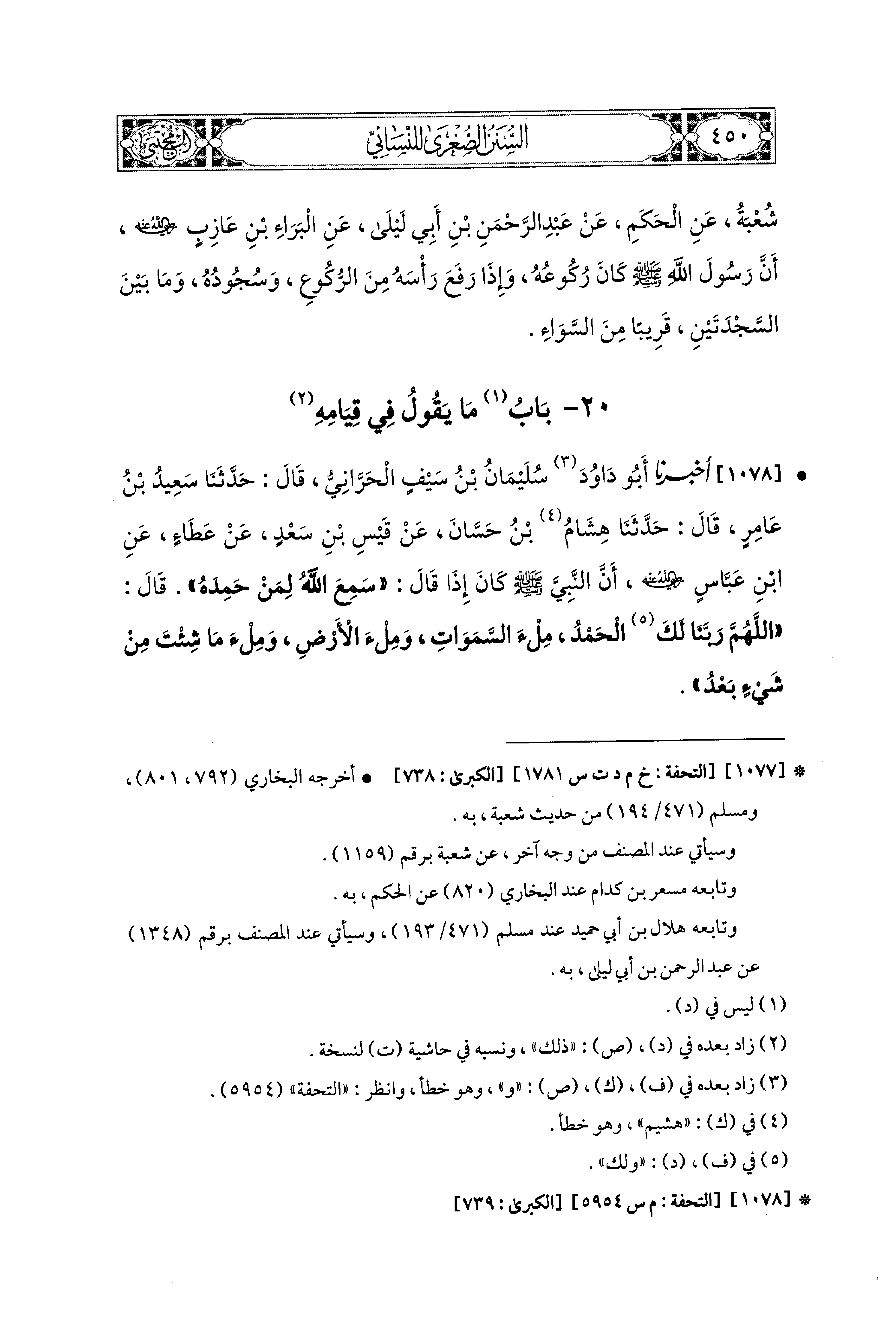 1078- أَخبَرنا أَبو دَاوُدَ سُلَيمَانُ بنُ سَيْفٍ الحَرَّانيُّ، قال: حَدثنا سَعيدُ بنُ عَامِرٍ، قال: حَدثنا هِشَامُ بنُ حَسَّانَ، عَن قَيْسِ بْنِ سَعْدٍ، عَن عَطَاءٍ، عَنِ ابنِ عَبَّاسٍ رَضِيَ اللهُ عَنهُ، أَنَّ النَّبيَّ صَلى الله عَليه وسَلم كَانَ إِذَا قَالَ: سَمِعَ اللهُ لِمَنْ حَمِدَهُ، قَالَ: اللهُمَّ رَبَّنَا لَكَ الحَمْدُ مِلْءَ السَّمَاواتِ، وَمِلْءَ الأَرضِ، وَمِلْءَ مَا شِئْتَ مِنْ شَيْءٍ بَعْدُ.