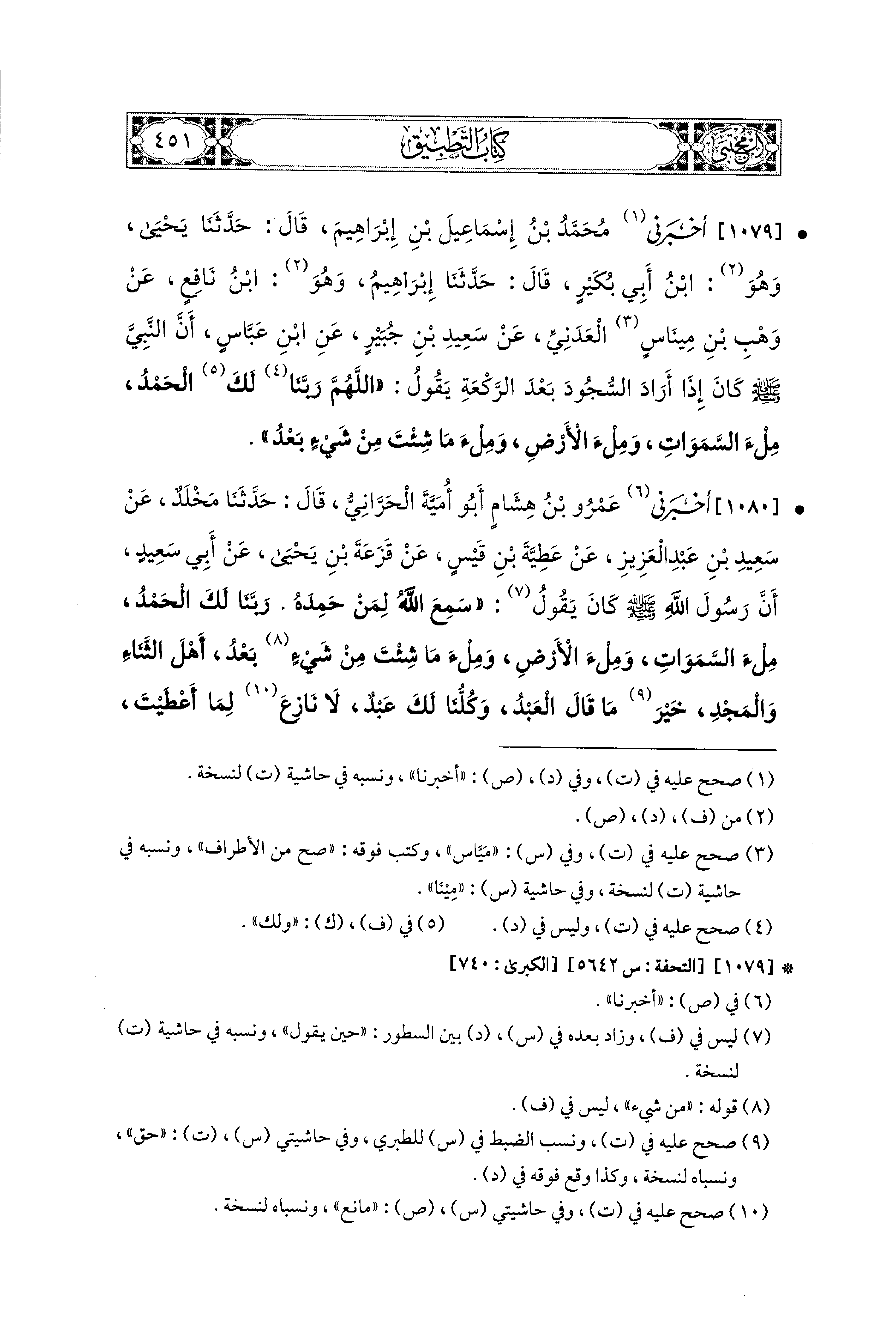 1079- أَخْبَرَنَي مُحَمدُ بنُ إِسماعِيلَ بْنِ إِبراهِيمَ، قال: حَدثنا يَحيَى وَهُوَ بنُ أَبي بُكَيْرٍ، قال: حَدثنا إِبراهِيمُ وَهُوَ بنُ نَافِعٍ، عَن وَهْبِ بْنِ مِينَاسٍ العَدَنيِّ، عَن سَعيدِ بْنِ جُبَيْرٍ، عَنِ ابنِ عَبَّاسٍ، أَنَّ النَّبيَّ صَلى الله عَليه وسَلم كَانَ إِذَا أَرَادَ السُّجُودَ بَعْدَ الرَّكْعَةِ يَقُولُ: اللهُمَّ رَبَّنَا لَكَ الحَمْدُ مِلْءَ السَّمَاواتِ وَمِلْءَ الأَرضِ وَمِلْءَ مَا شِئْتَ مِنْ شَيْءٍ بَعْدُ.