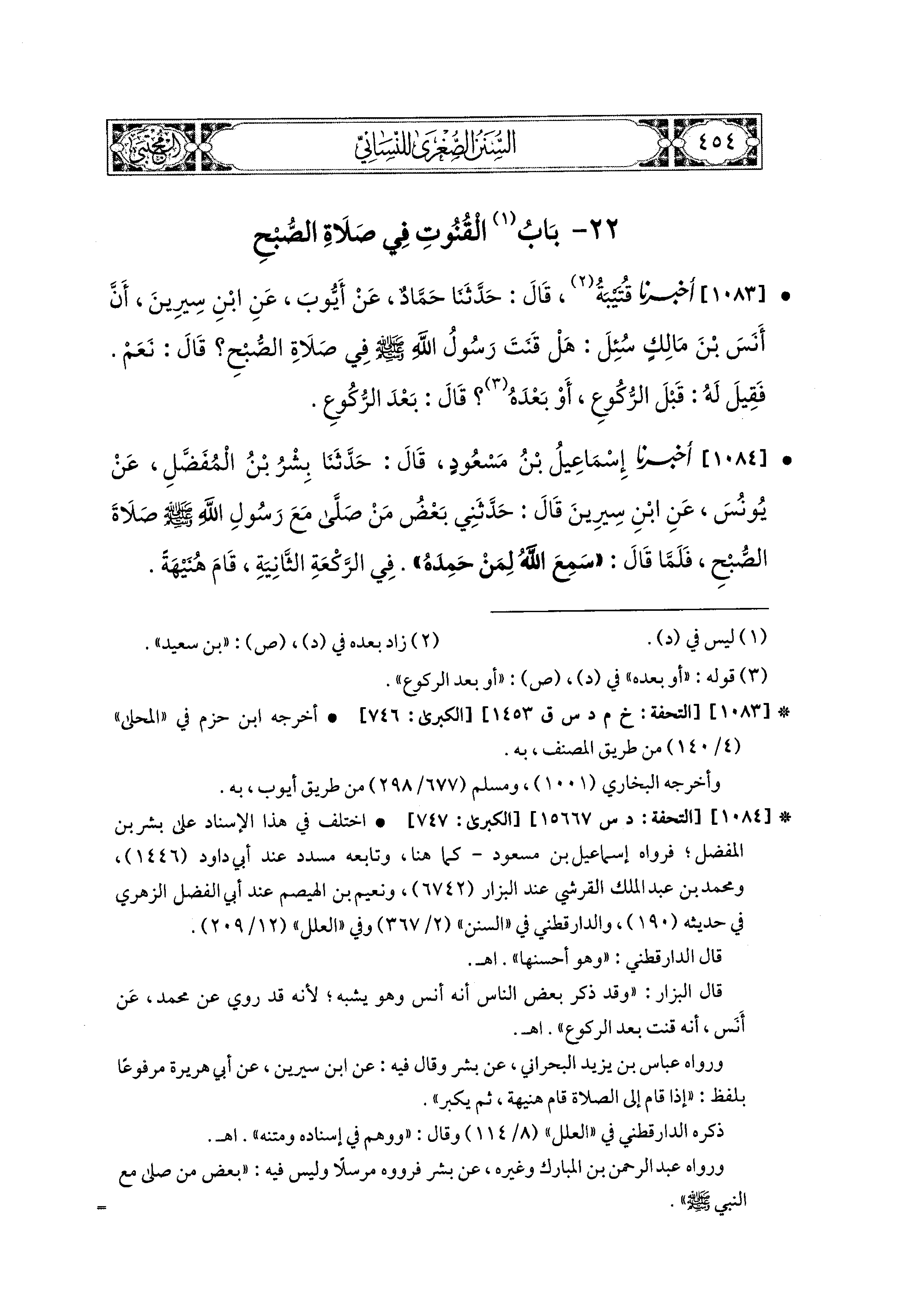 1083- أَخبَرنا قُتَيبَةُ، قال: حَدثنا حَمَّادٌ، عَن أَيُّوبَ، عَنِ ابنِ سِيرِينَ، أَنَّ أَنَسَ بْنَ مَالِكٍ سُئِلَ: هَلْ قَنَتَ رَسُولُ اللهِ صَلى الله عَليه وسَلم فِي صَلاَةِ الصُّبْحِ؟ قَالَ: نَعَمْ، فَقِيلَ لَهُ: قَبْلَ الرُّكُوعِ، أَوْ بَعْدَهُ؟ قَالَ: بَعْدَ الرُّكُوعِ.