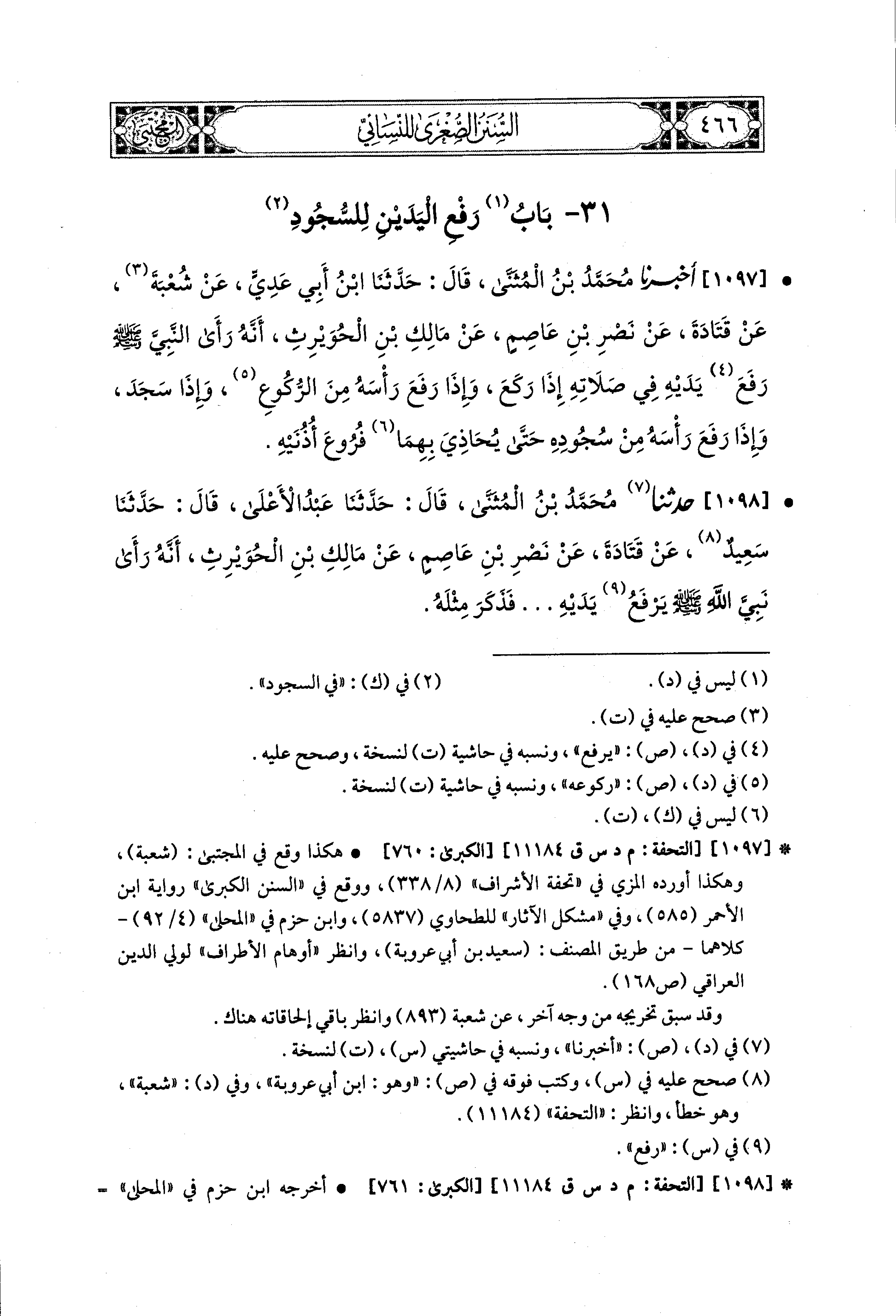 1097- أَخبَرنا مُحَمد بنُ المُثَنَّى، قال: حَدثنا ابنُ أَبي عُدَيٍّ، عَن شُعبَةَ، عَن قَتَادَةَ، عَن نَصْرِ بْنِ عَاصِمٍ، عَن مَالِكِ بْنِ الحُوَيْرِثِ أَنَّهُ رَأَى النَّبيَّ صَلى الله عَليه وسَلم رَفَعَ يَدَيْهِ فِي صَلاَتِهِ إِذَا رَكَعَ، وَإِذَا رَفَعَ رَأْسَهُ مِنَ الرُّكُوعِ، وَإِذَا سَجَدَ، وَإِذَا رَفَعَ رَأْسَهُ مِنَ السُّجُودِ حَتَّى يُحَاذِيَ بِهِمَا فُرُوعَ أُذُنَيْهِ.