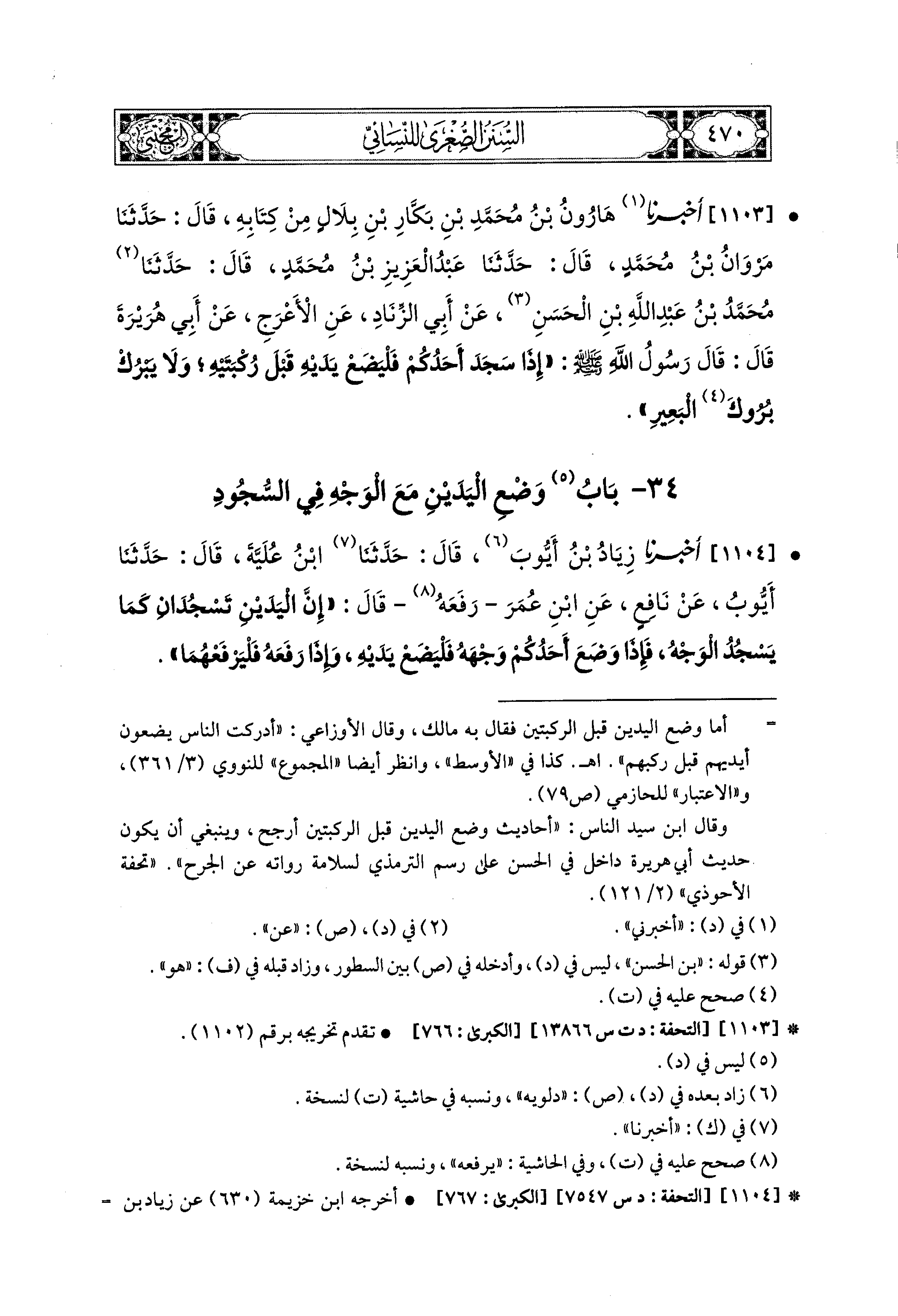 1104- أَخبَرنا زِيَادُ بنُ أَيُّوبَ، قال: حَدثنا ابنُ عُلَيَّةَ، قال: حَدثنا أَيُّوبُ، عَن نَافِعٍ، عَنِ ابنِ عُمَرَ رَفَعَهُ، قَالَ: إِنَّ اليَدَيْنِ تَسْجُدَانِ كَمَا يَسْجُدُ الوَجْهُ، فَإِذَا وَضَعَ أَحَدُكُمْ وَجْهَهُ فَلْيَضَعْ يَدَيْهِ، وَإِذَا رَفَعَهُ فَلْيَرْفَعْهُمَا.