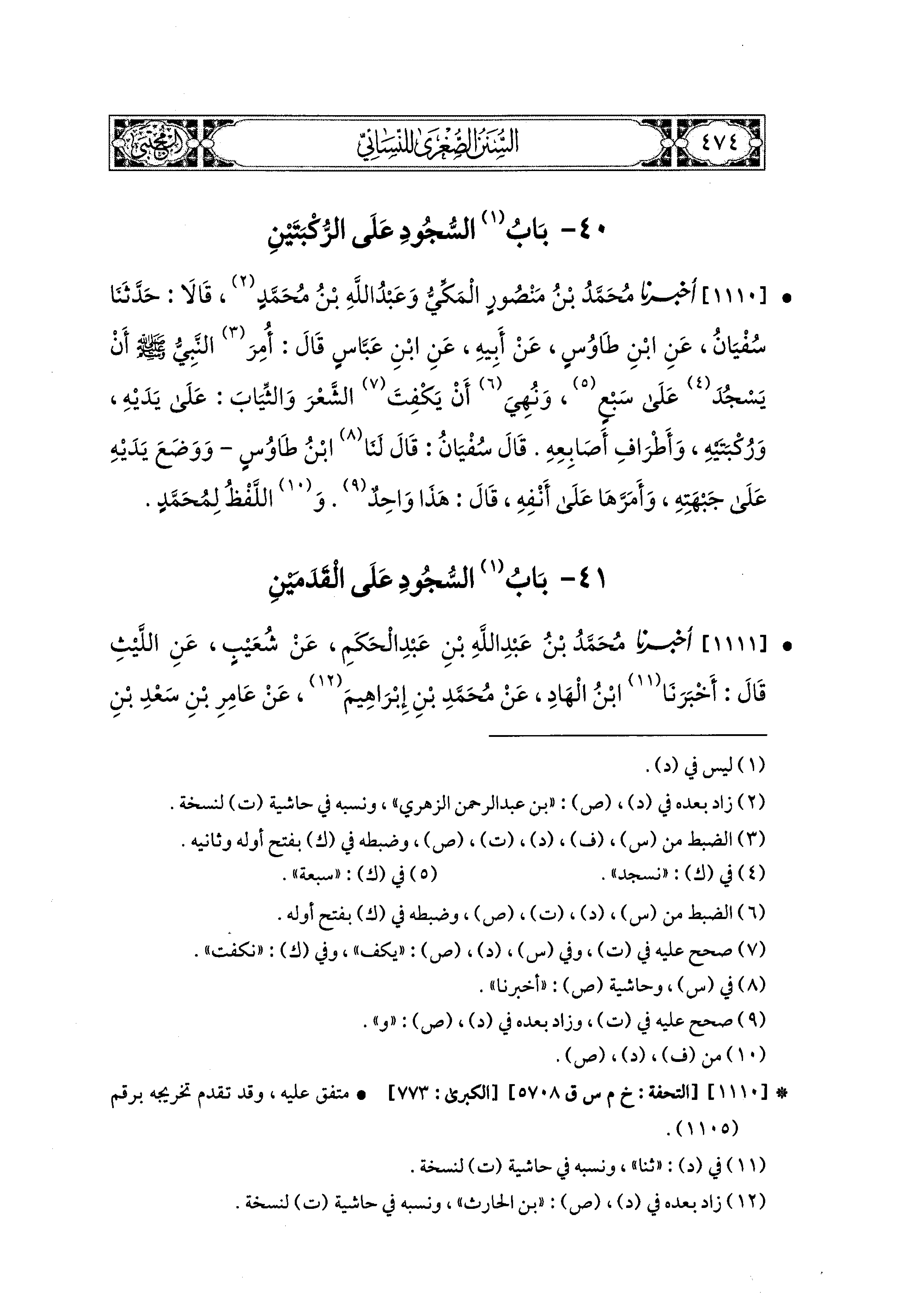 1110- أَخبَرنا مُحَمد بنُ مَنْصُورٍ المَكِّيُّ، وَعَبدُ اللهِ بنُ مُحَمدِ، قَالاَ: حَدثنا سُفيان، عَنِ ابنِ طَاوُسٍ، عَن أَبيهِ، عَنِ ابنِ عَبَّاسٍ، أُمِرَ النَّبيُّ صَلى الله عَليه وسَلم أَنْ يَسْجُدَ عَلَى سَبْعٍ، وَنُهِيَ أَنْ يَكْفِتَ الشَّعْرَ وَالثِّيَابَ عَلَى يَدَيْهِ وَرُكْبَتَيْهِ وَأَطْرَافِ أَصَابِعِهِ.