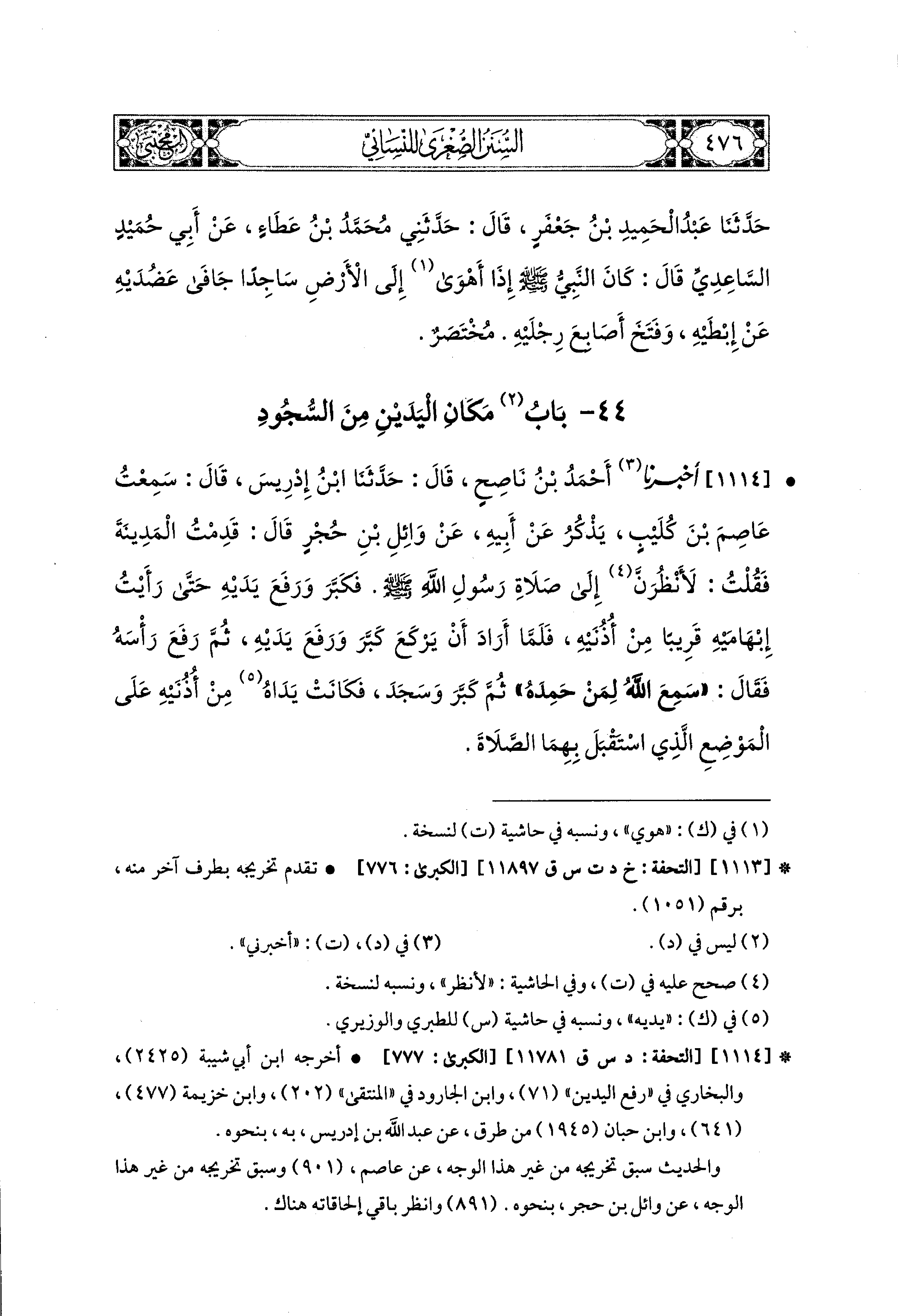 1114- أَخبَرني أَحْمَدُ بنُ نَاصِحٍ، قال: حَدثنا ابنُ إِدْرِيسَ، قَالَ: سَمِعْتُ عَاصِمَ بْنَ كُلَيْبٍ يَذْكُرُ، عَن أَبيهِ، عَن وَائِلِ بْنِ حُجْرٍ قَالَ: قَدِمْتُ المَدِينَةَ فَقُلْتُ: لأَنْظُرَنَّ إِلَى صَلاَةِ رَسُولِ اللهِ صَلى الله عَليه وسَلم، فَكَبَّرَ وَرَفَعَ يَدَيْهِ حَتَّى رَأَيْتُ إِبْهَامَيْهِ قَرِيبًا مِنْ أُذُنَيْهِ، فَلَمَّا أَرَادَ أَنْ يَرْكَعَ كَبَّرَ وَرَفَعَ يَدَيْهِ، ثُمَّ رَفَعَ رَأْسَهُ فَقَالَ: سَمِعَ اللهُ لِمَنْ حَمِدَهُ، ثُمَّ كَبَّرَ وَسَجَدَ، فَكَانَتْ يَدَاهُ مِنْ أُذُنَيْهِ عَلَى المَوْضِعِ الَّذِي اسْتَقْبَلَ بِهِمَا الصَّلاَةَ.