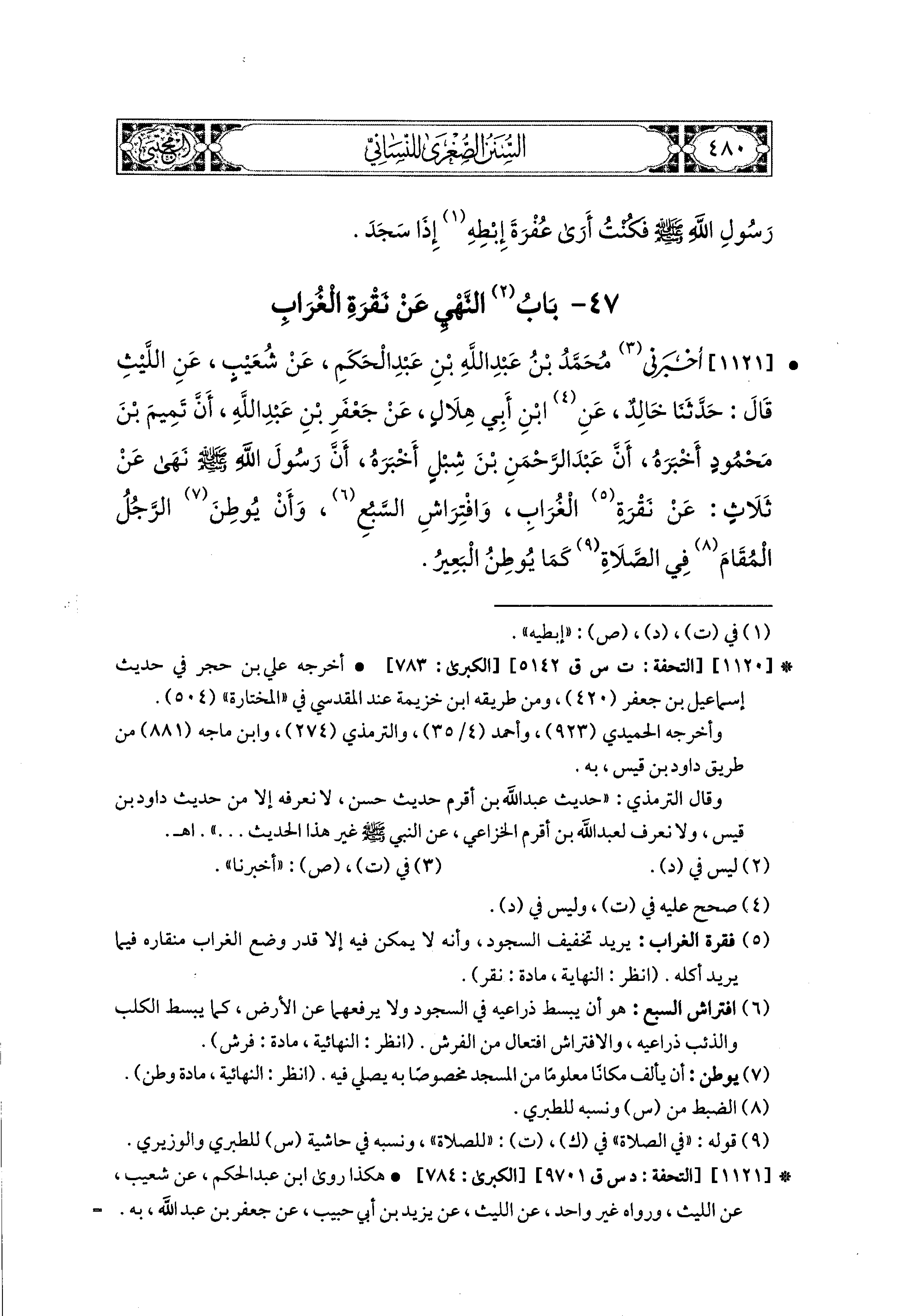 1121- أَخْبَرَنِي مُحَمد بنُ عَبدِ اللهِ بْنِ عَبدِ الحَكَمِ، عَن شُعَيبٍ، عَنِ اللَّيْثِ، قال: حَدثنا خَالِدٌ، عَنِ ابنِ أَبي هِلاَلٍ، عَن جَعْفَرِ بْنِ عَبدِ اللهِ، أَنَّ تَمِيمَ بْنَ مَحْمُودٍ أَخْبَرَهُ، أَنَّ عَبدَ الرَّحْمَنِ بْنَ شِبْلٍ أَخْبَرَهُ، أَنَّ رَسُولَ اللهِ صَلى الله عَليه وسَلم نَهَى عَن ثَلاَثٍ: عَن نَقْرَةِ الغُرَابِ، وَافْتِرَاشِ السَّبُعِ، وَأَنْ يُوَطِّنَ الرَّجُلُ المَقَامَ في الصَّلاَةِ كَمَا يُوَطِّنُ البَعِيرُ.