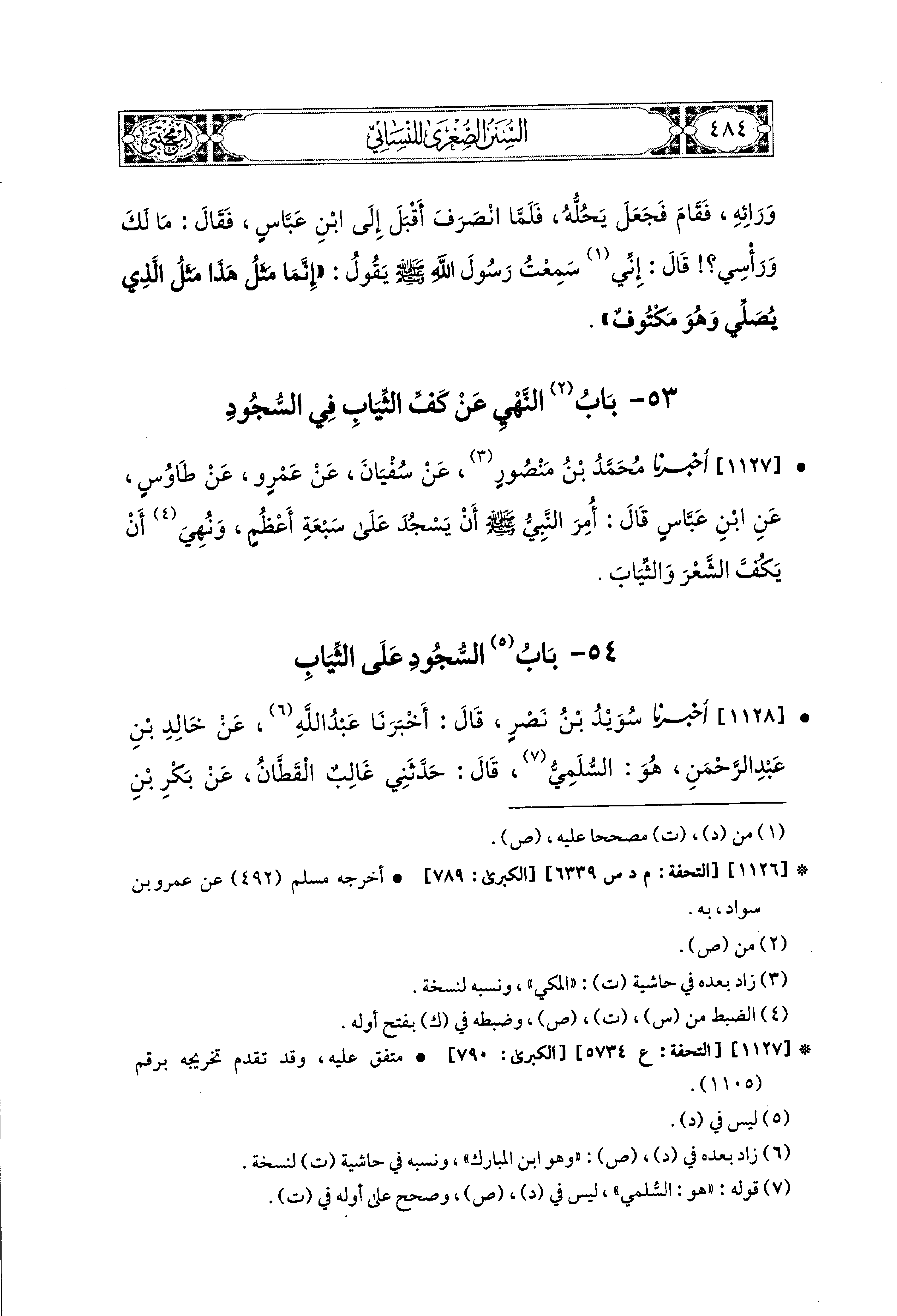 1127- أَخبَرنا مُحَمد بنُ مَنْصُورٍ، عَن سُفيَانَ، عَن عَمْرٍو، عَن طَاوُسٍ، عَنِ ابنِ عَبَّاسٍ، قَالَ: أُمِرَ النَّبيُّ صَلى الله عَليه وسَلم أَنْ يَسْجُدَ عَلَى سَبْعَةِ أَعْظُمٍ، وَنُهِيَ أَنْ يَكُفَّ الشَّعْرَ وَالثِّيَابَ.