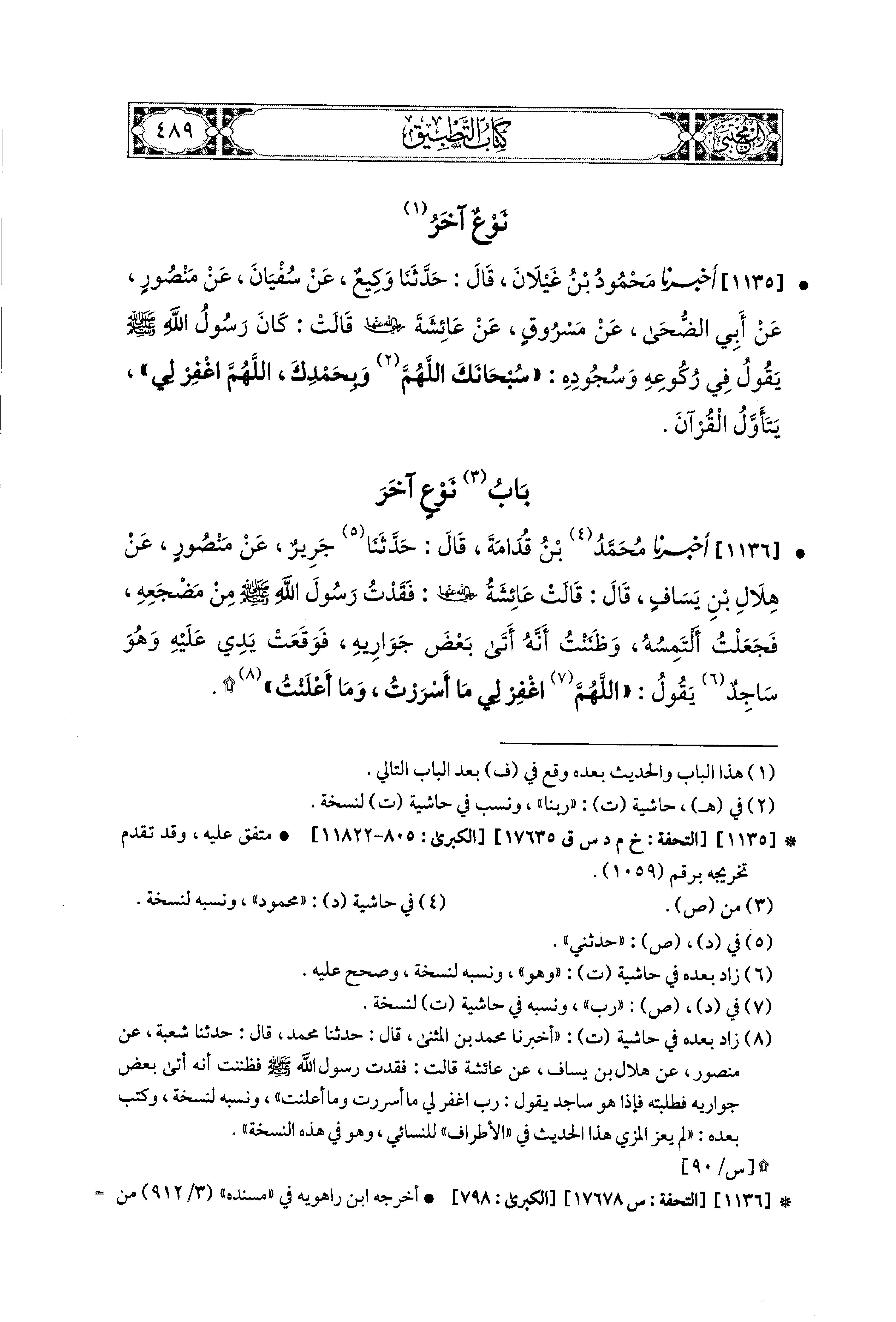 1135- أَخبَرنا مَحْمُودُ بنُ غَيْلاَنَ، قال: حَدثنا وَكِيعٌ، عَن سُفيَانَ، عَن مَنْصُورٍ، عَن أَبي الضُّحَى، عَن مَسْرُوقٍ، عَن عَائِشَةَ رَضِيَ اللهُ عَنهَا، قَالَتْ: كَانَ رَسُول الله صَلى الله عَليه وسَلم يَقُولُ فِي رُكُوعِهِ وَسُجُودِهِ: سُبْحَانَكَ اللهُمَّ رَبَّنَا وَبِحَمْدِكَ، اللهُمَّ اغْفِرْ لِي يَتَأَوَّلُ القُرْآنَ.