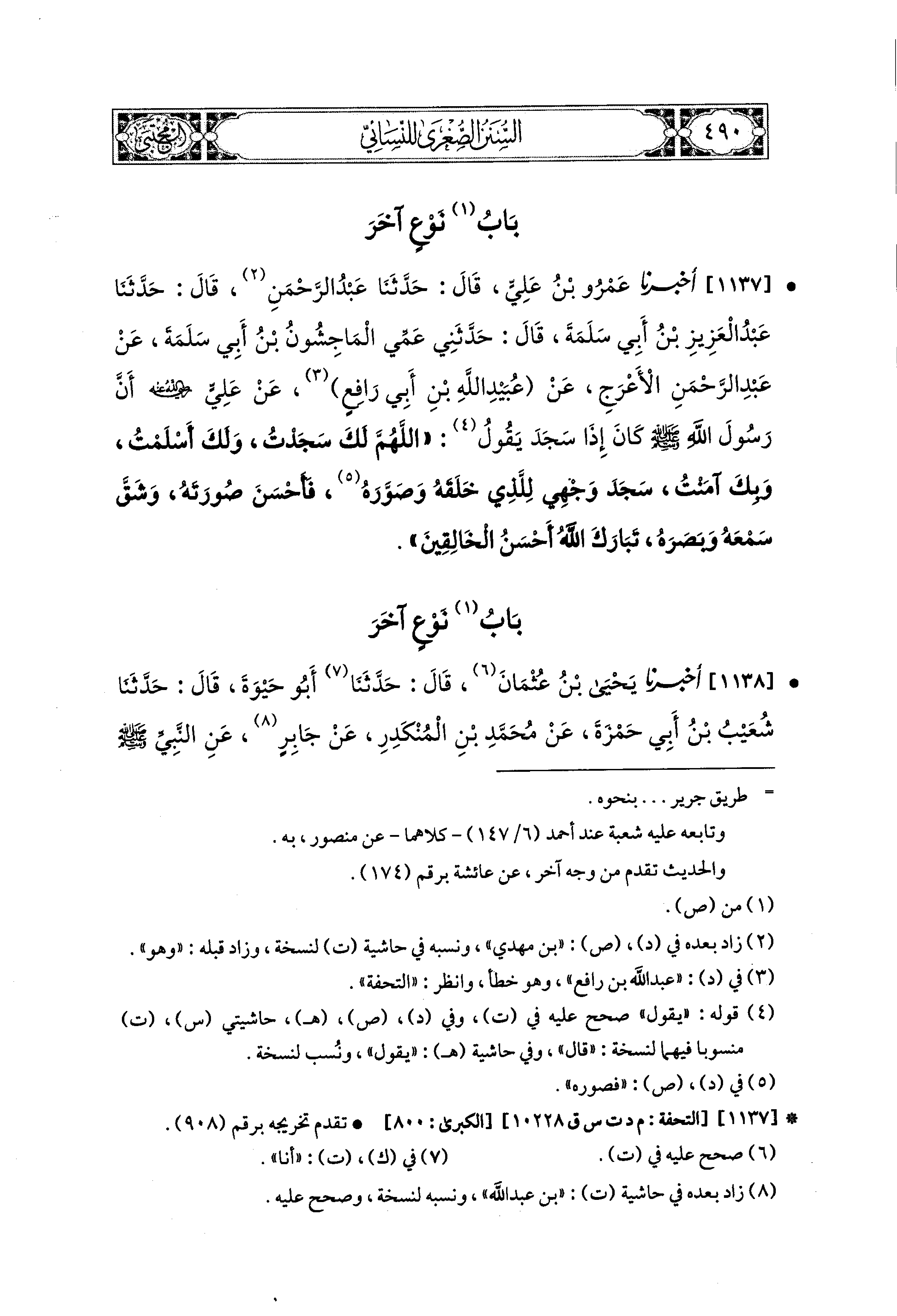 1137- أَخبَرنا عَمْرُو بنُ عَلِيٍّ، قال: حَدثنا عَبدُ الرَّحْمَنِ، قال: حَدثنا عَبدُ العَزِيزِ بنُ أَبي سَلَمَةَ، قَالَ: حَدَّثَني عَمِّي المَاجِشُونُ بنُ أَبي سَلَمَةَ، عَن عَبدِ الرَّحْمَنِ الأَعْرَجِ، عَن عُبَيدِ اللهِ بْنِ أَبي رَافِعٍ، عَن عَلِيٍّ رَضِيَ اللهُ عَنهُ، أَنَّ رَسُول الله صَلى الله عَليه وسَلم كَانَ إِذَا سَجَدَ يَقُولُ: اللهُمَّ لَكَ سَجَدْتُ، وَلَكَ أَسْلَمْتُ، وَبِكَ آمَنْتُ، سَجَدَ وَجْهِي لِلَّذِي خَلَقَهُ وَصَوَّرَهُ فَأَحْسَنَ صُورَتَهُ وَشَقَّ سَمْعَهُ وَبَصَرَهُ، تَبَارَكَ اللهُ أَحْسَنُ الخَالِقِينَ.