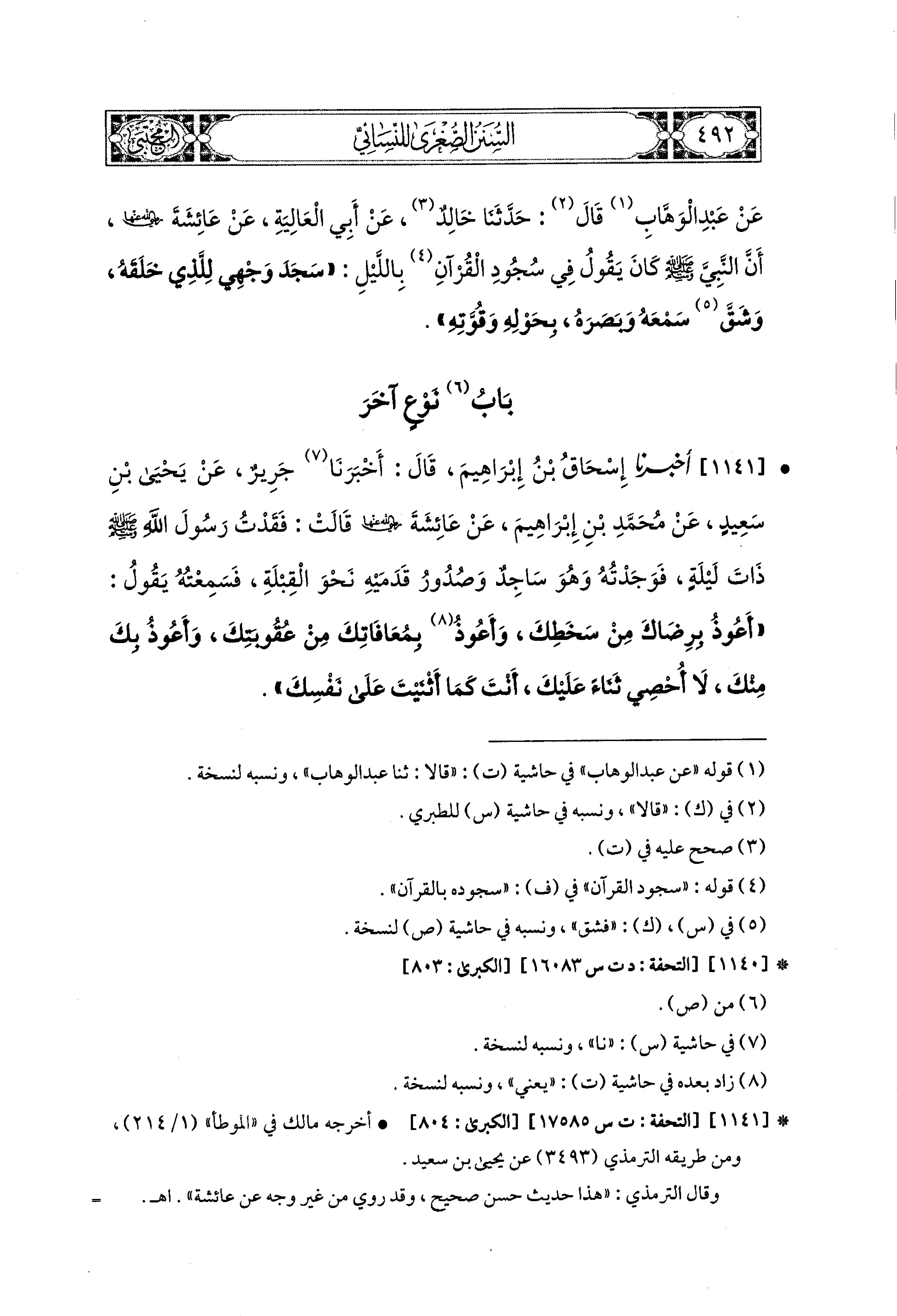 1141- أَخبَرنا إِسحَاقُ بنُ إِبراهِيمَ، قَالَ: أَخبَرنا جَرِيرٌ، عَن يَحيَى بْنِ سَعيدٍ، عَن مُحَمدِ بْنِ إِبراهِيمَ، عَن عَائِشَةَ رَضِيَ اللهُ عَنهَا قَالَتْ: فَقَدْتُ رَسُولَ اللهِ صَلى الله عَليه وسَلم ذَاتَ لَيْلَةٍ، فَوَجَدْتُهُ وَهُوَ سَاجِدٌ وَصُدُورُ قَدَمَيْهِ نَحْوَ القِبْلَةِ، فَسَمِعْتُهُ يَقُولُ: أَعُوذُ بِرِضَاكَ مِنْ سَخَطِكَ، وَأَعُوذُ بِمُعَافَاتِكَ مِنْ عُقُوبَتِكَ، وَأَعُوذُ بِكَ مِنْكَ، لاَ أُحْصِي ثَنَاءً عَلَيْكَ أَنَتْ كَمَا أَثْنَيْتَ عَلَى نَفْسِكَ.