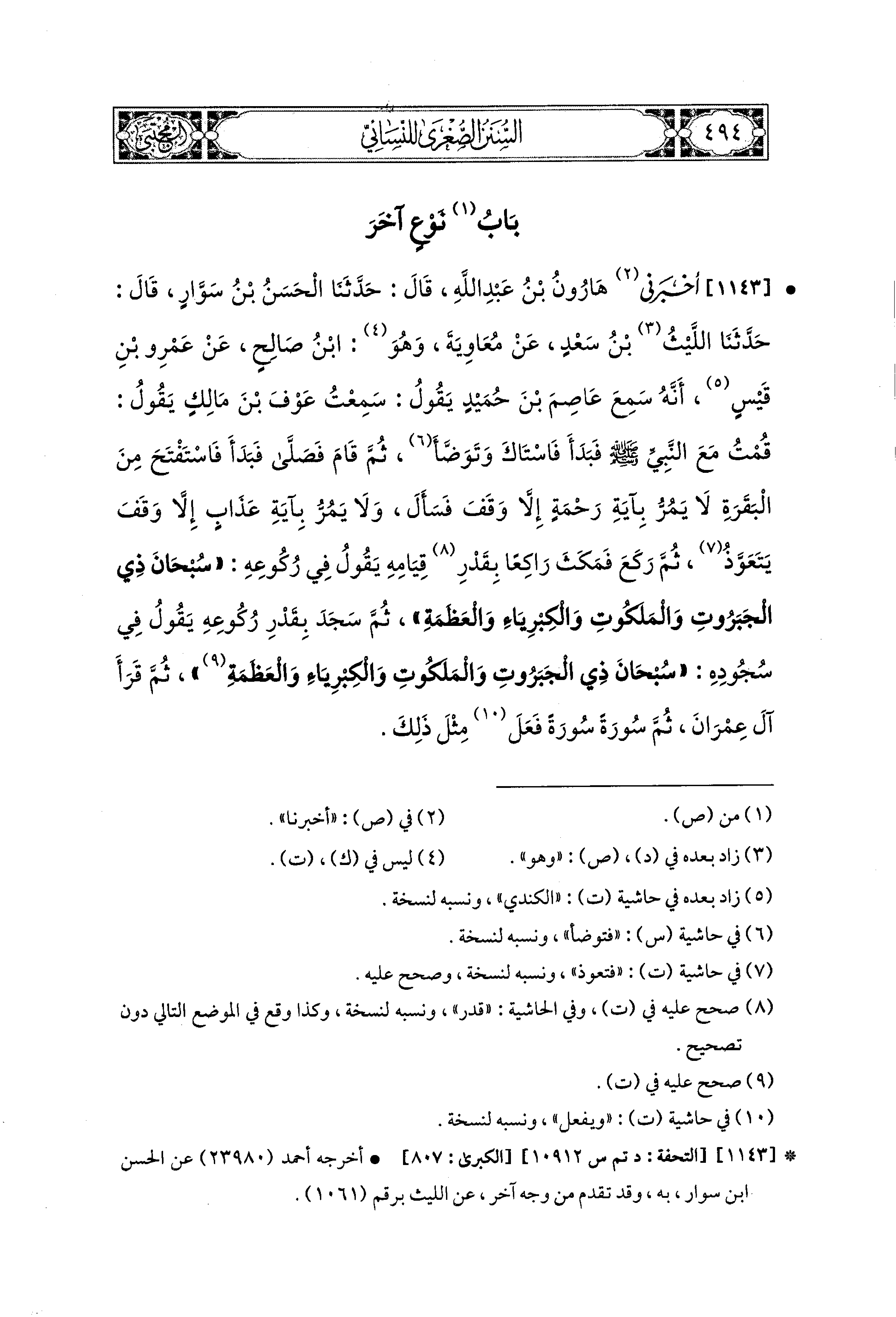1143- أَخبَرني هَارُونُ بنُ عَبدِ اللهِ، قال: حَدثنا الحَسَنُ بنُ سَوَّارٍ، قال: حَدثنا الَيْثُ بنُ سَعْدٍ، عَن مُعَاوِيَةَ وَهُوَ ابنِ صَالِحٍ، عَن عَمْرِو بْنِ قَيْسٍ، أَنَّهُ سَمِعَ عَاصِمَ بْنَ حُمَيدٍ يَقُولُ: سَمِعْتُ عَوْفَ بْنَ مَالِكٍ يَقُولُ: قُمْتُ مَعَ النَّبيِّ صَلى الله عَليه وسَلم فَبَدَأَ فَاسْتَاكَ وَتَوَضَّأَ، ثُمَّ قَامَ فَصَلَّى فَبَدَأَ فَاسْتَفْتَحَ مِنَ البَقَرَةِ، لاَ يَمُرُّ بِآيَةِ رَحْمَةٍ إِلاَّ وَقَفَ فَسَأَلَ، وَلاَ يَمُرُّ بِآيَةِ عَذَابٍ إِلاَّ وَقَفَ يَتَعَوَّذُ، ثُمَّ رَكَعَ فَمَكَثَ رَاكِعًا بِقَدْرِ قِيَامِهِ، يَقُولُ فِي رُكُوعِهِ: سُبْحَانَ ذِي الجَبَرُوتِ وَالمَلَكُوتِ وَالكِبْرِيَاءِ وَالعَظَمَةِ، ثُمَّ سَجَدَ بِقَدْرِ رُكُوعِهِ يَقُولُ فِي سُجُودِهِ: سُبْحَانَ ذِي الجَبَرُوتِ وَالمَلَكُوتِ وَالكِبْرِيَاءِ وَالعَظَمَةِ، ثُمَّ قَرَأَ آلَ عِمْرَانَ، ثُمَّ سُورَةً، سُورَةً، فَعَلَ مِثْلَ ذَلِكَ.