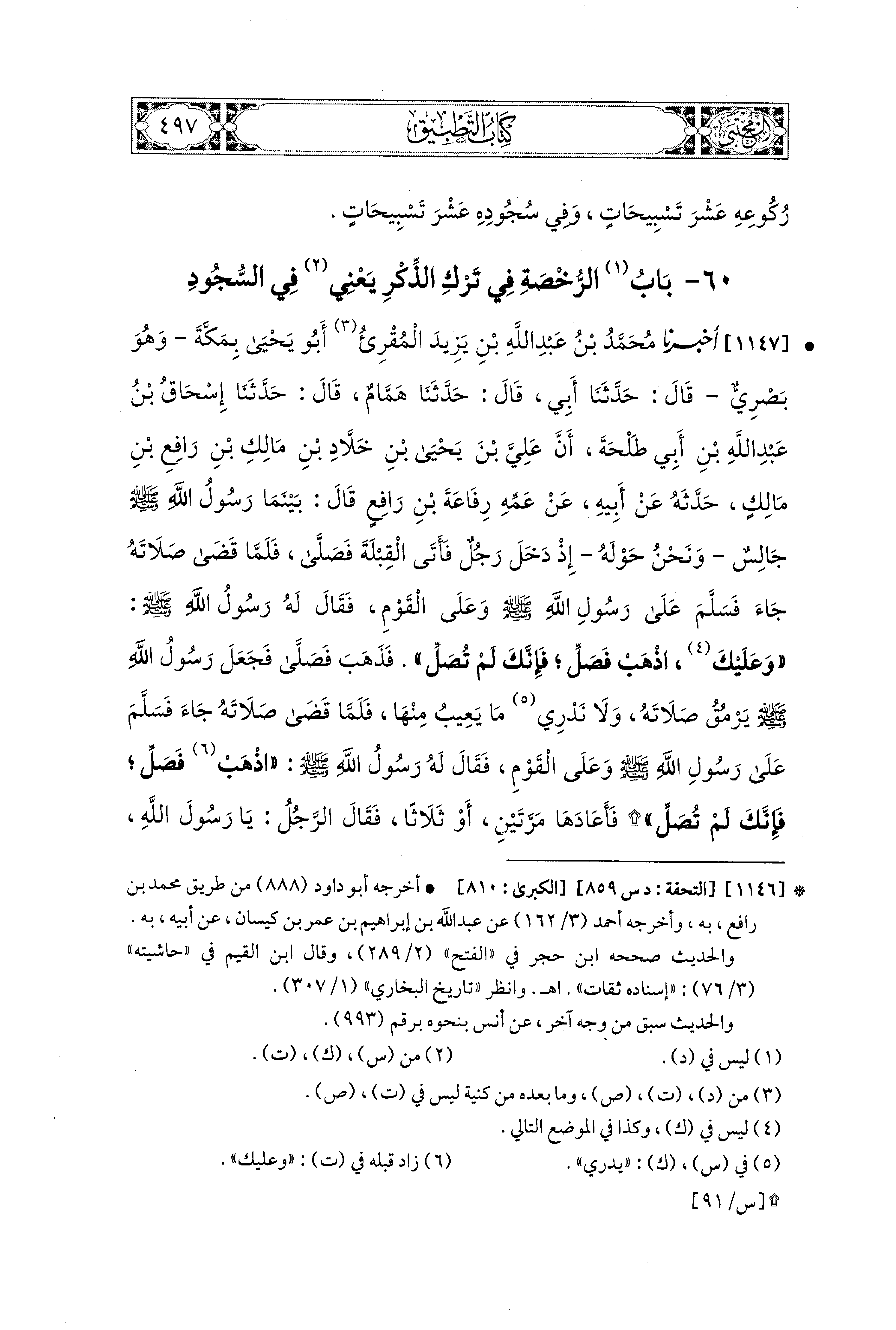 1147- أَخبَرنا مُحَمد بنُ عَبدِ اللهِ بْنِ يَزِيدَ المُقْرِئُ أَبو يَحيَى بِمَكَّةَ وَهُوَ بَصْرِيٌّ، قال: حَدثنا أَبي، قال: حَدثنا هَمَّامٌ، قال: حَدثنا إِسحَاقُ بنُ عَبدِ اللهِ بْنِ أَبي طَلْحَةَ، أَنَّ عَلِيَّ بْنَ يَحيَى بْنِ خَلاَّدِ بْنِ رَافِعِ بْنِ مَالِكٍ (1) حَدَّثَهُ، عَن أَبيهِ، عَن عَمِّهِ رِفَاعَةَ بْنِ رَافِعٍ قَالَ: بَيْنَمَا رَسُولُ اللهِ صَلى الله عَليه وسَلم جَالِسٌ وَنَحْنُ حَوْلَهُ، إِذْ دَخَلَ رَجُلٌ فَأَتَى القِبْلَةَ فَصَلَّى، فَلَمَّا قَضَى صَلاَتَهُ جَاءَ فَسَلَّمَ عَلَى رَسُولِ اللهِ صَلى الله عَليه وسَلم وَعَلَى القَوْمِ، فَقَالَ لَهُ رَسُولُ اللهِ صَلى الله عَليه وسَلم: وَعَلَيْكَ، اذْهَبْ فَصَلِّ فَإِنَّكَ لَمْ تُصَلِّ، فَذَهَبَ فَصَلَّى، فَجَعَلَ رَسُولُ اللهِ صَلى الله عَليه وسَلم يَرْمُقُ صَلاَتَهُ، وَلاَ نَدْرِي مَا يَعِيبُ مِنْهَا، فَلَمَّا قَضَى صَلاَتَهُ، جَاءَ فَسَلَّمَ عَلَى رَسُولِ اللهِ صَلى الله عَليه وسَلم وَعَلَى القَوْمِ، فَقَالَ لَهُ رَسُولُ اللهِ صَلى الله عَليه وسَلم: اذْهَبْ فَصَلِّ فَإِنَّكَ لَمْ تُصَلِّ، فَأَعَادَهَا مَرَّتَيْنِ، أَوْ ثَلاَثًا، فَقَالَ الرَّجُلُ: يَا رَسُولَ اللهِ، مَا عِبْتَ مِنْ صَلاَتِي؟