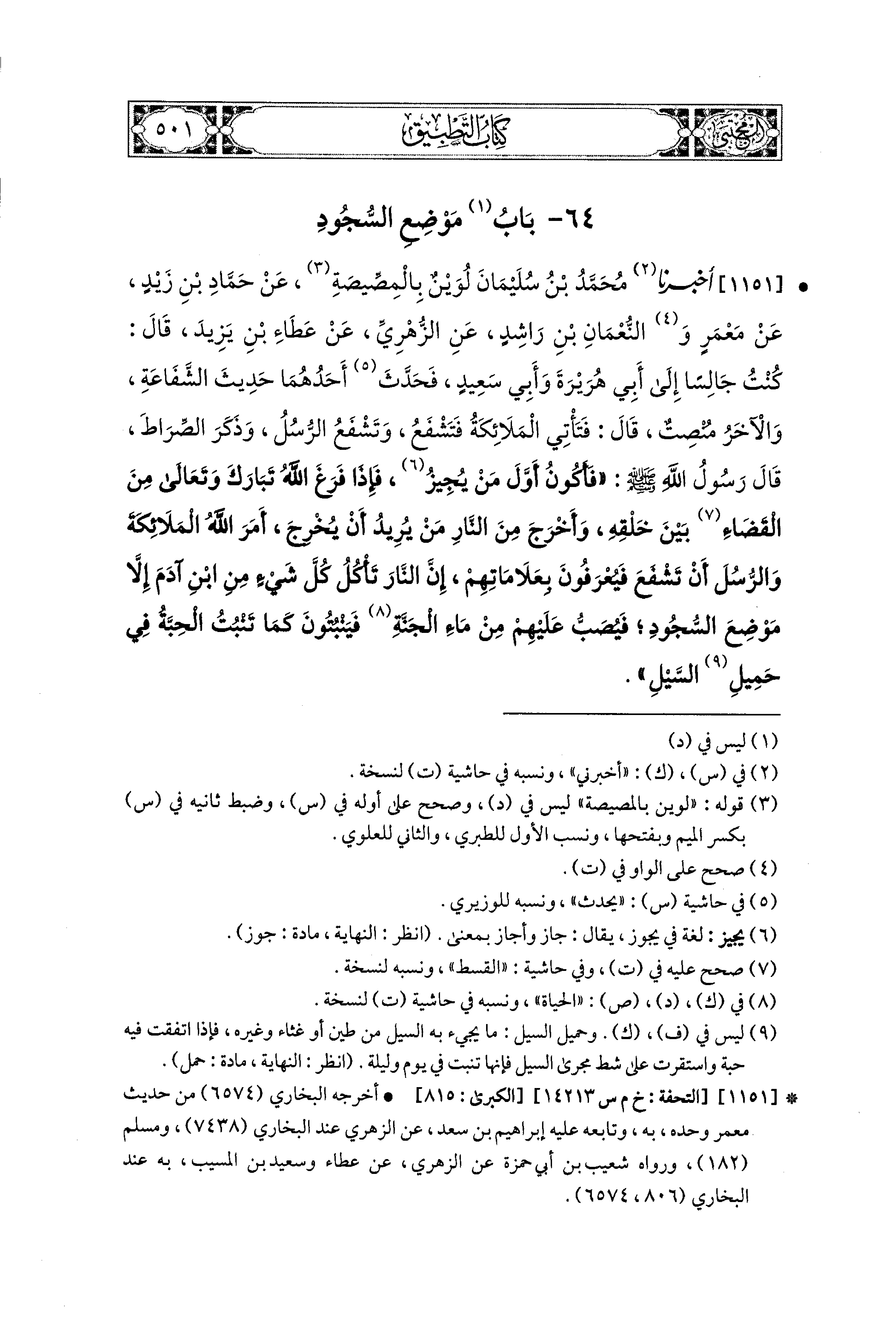 1151- أَخبَرنا مُحَمد بنُ سُلَيمَانَ لُوَيْنٌ بِالمَصِّيْصَةِ، عَن حَمَّادِ بْنِ زَيْدٍ، عَن مَعْمَرٍ، وَالنُّعْمَانُ بنُ رَاشِدٍ، عَنِ الزُّهْرِيِّ، عَن عَطَاءِ بْنِ يَزِيدَ، قَالَ: كُنْتُ جَالِسًا إِلَى أَبي هُرَيْرَةَ، وَأَبي سَعيدٍ فَحَدَّثَ أَحَدُهُمَا حَدِيثَ الشَّفَاعَةِ وَالآخَرُ مُنْصِتٌ، قَالَ: فَتَأْتِي المَلاَئِكَةُ فَتَشْفَعُ وَتَشْفَعُ الرُّسُلُ، وَذَكَرَ الصِّرَاطَ، قَالَ رَسُولُ اللهِ صَلى الله عَليه وسَلم: فَأَكُونُ أَوَّلَ مَنْ يُجِيزُ، فَإِذَا فَرَغَ اللهُ تبارك وتعالى مِنَ القَضَاءِ بَيْنَ خَلْقِهِ، وَأَخْرَجَ مِنَ النَّارِ مَنْ يُرِيدُ أَنْ يُخْرِجَ، أَمَرَ اللهُ المَلاَئِكَةَ وَالرُّسُلَ أَنْ تَشْفَعَ، فَيُعْرَفُونَ بِعَلاَمَاتِهِمْ إِنَّ النَّارَ تَأْكُلُ كُلَّ شَيْءٍ مِنَ ابنِ آدَمَ إِلاَّ مَوْضِعَ السُّجُودِ، فَيُصَبُّ عَلَيهِمْ مِنْ مَاءِ الجَنَّةِ فَيَنْبُتُونَ كَمَا تَنْبُتُ الحِبَّةُ فِي حَمِيلِ السَّيْلِ.
