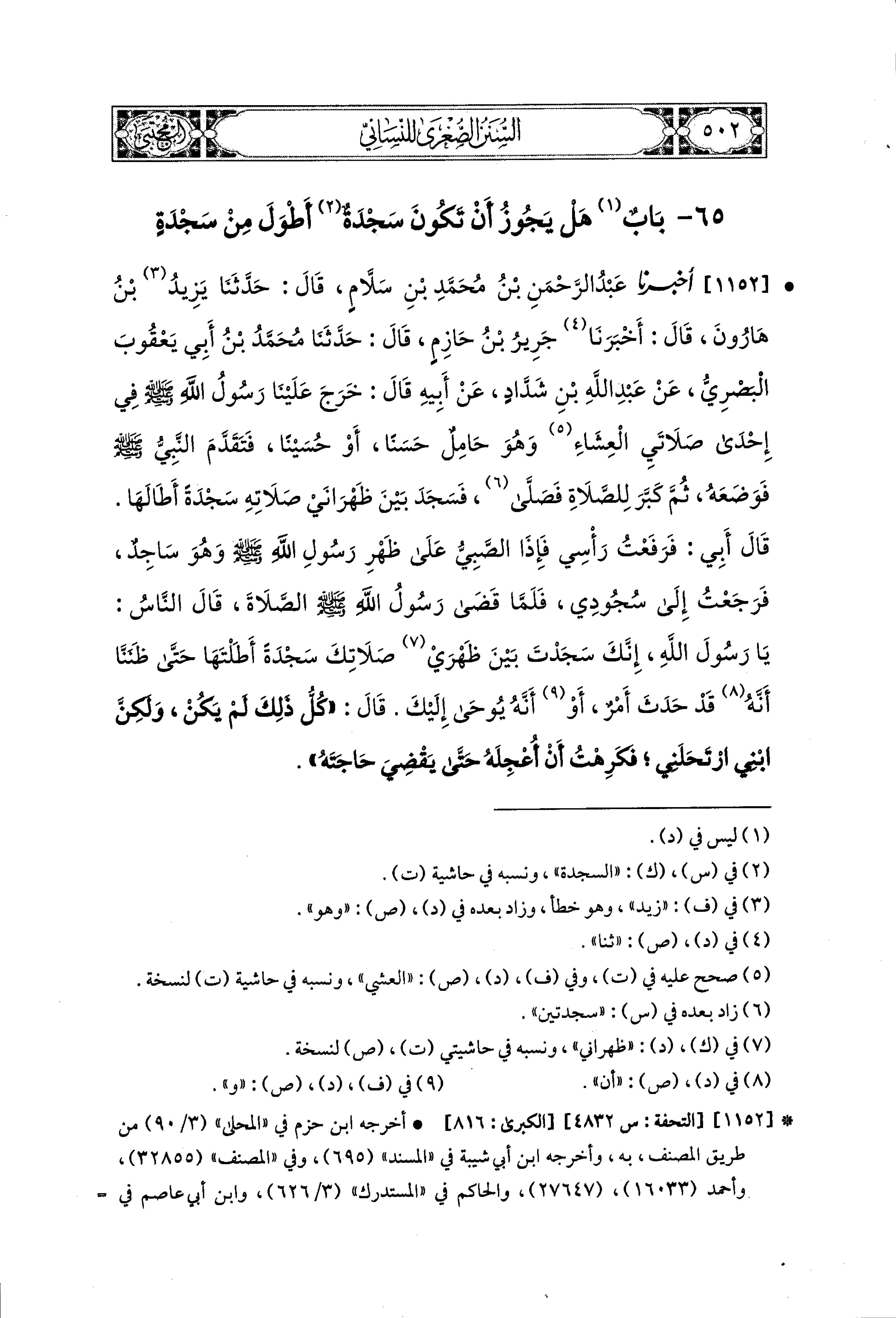 1152- أَخبَرنا عَبدُ الرَّحْمَنِ بنُ مُحَمدِ بْنِ سَلاَّمٍ، قال: حَدثنا يَزِيدُ بنُ هَارُونَ، قَالَ: أَخبَرنا جَرِيرُ بنُ حَازِمٍ، قال: حَدثنا مُحَمدُ بنُ أَبي يَعقُوبَ البَصْرِيُّ، عَن عَبد اللهِ بن شَدَّادٍ، عَن أَبيهِ، قَالَ: خَرَجَ عَلَيْنَا رَسُولُ اللهِ صَلى الله عَليه وسَلم فِي إِحْدَى صَلاَتَيِ العِشَاءِ وَهُوَ حَامِلٌ حَسَنًا، أَوْ حُسَيْنًا، فَتَقَدَّمَ النَّبيَّ صَلى الله عَليه وسَلم فَوَضَعَهُ، ثُمَّ كَبَّرَ لِلصَّلاَةِ فَصَلَّى فَسَجَدَ بَيْنَ ظَهْرَانَيْ صَلاَتِهِ سَجْدَةً أَطَالَهَا، قَالَ أَبي: فَرَفَعْتُ رَأْسِي فَإِذَا الصَّبِيُّ عَلَى ظَهْرِ رَسُولِ اللهِ صَلى الله عَليه وسَلم، وَهُوَ سَاجِدٌ فَرَجَعْتُ إِلَى سُجُودِي، فَلَمَّا قَضَى رَسُولُ اللهِ صَلى الله عَليه وسَلم الصَّلاَةَ، قَالَ النَّاسُ: يَا رَسُولَ اللهِ، إِنَّكَ سَجَدْتَ بَيْنَ ظَهْرَي صَلاَتِكَ سَجْدَةً أَطَلْتَهَا حَتَّى ظَنَنَّا أَنَّهُ قَدْ حَدَثَ أَمْرٌ، أَوْ أَنَّهُ يُوحَى إِلَيْكَ، قَالَ: كُلُّ ذَلِكَ لَمْ يَكُنْ، وَلَكِنَّ ابني ارْتَحَلَني فَكَرِهْتُ أَنْ أُعَجِّلَهُ حَتَّى يَقْضِيَ حَاجَتَهُ.