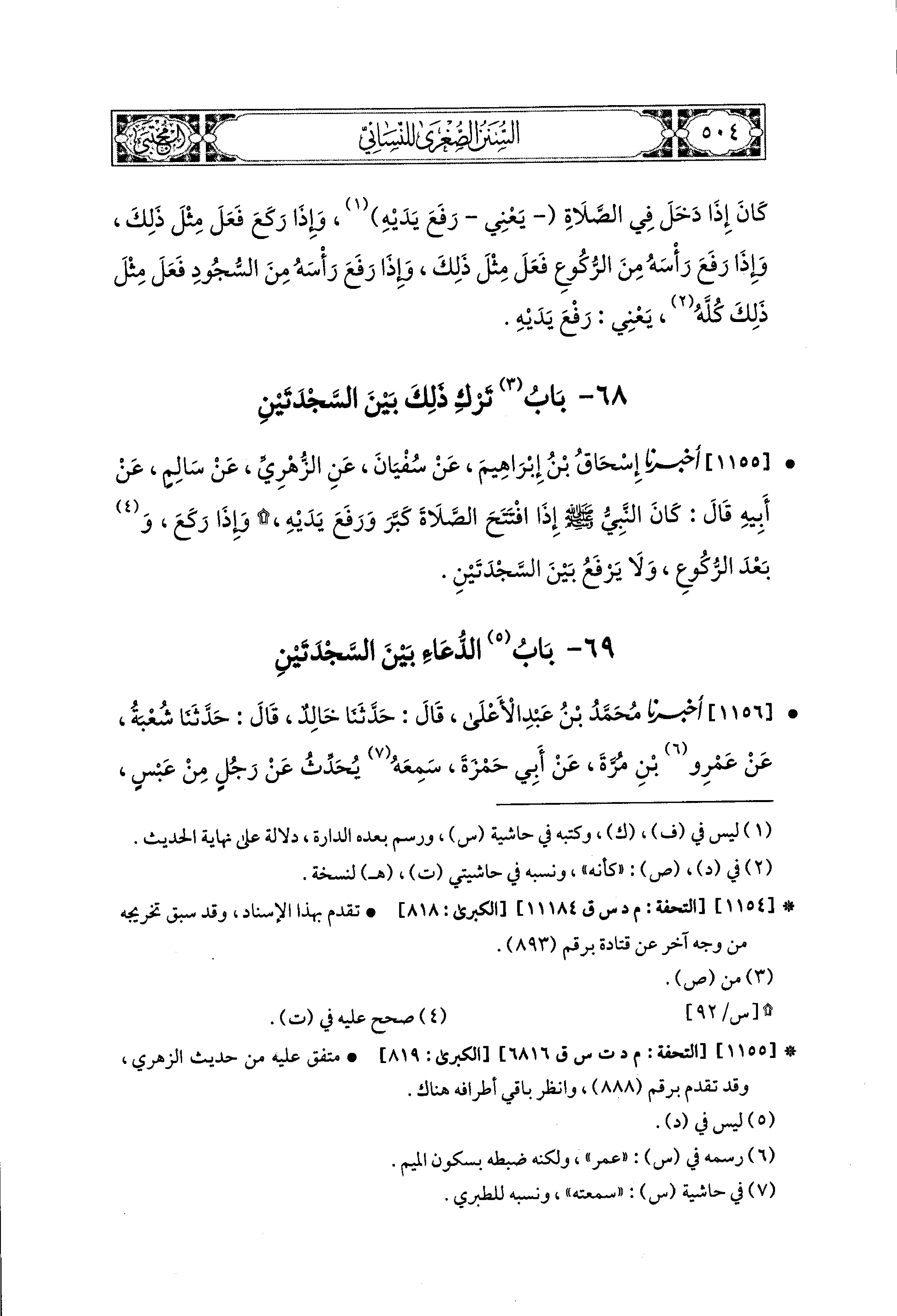 1155- أَخبَرنا إِسحَاقُ بنُ إِبراهِيمَ، عَن سُفيَانَ، عَنِ الزُّهْرِيِّ، عَن سَالِمٍ، عَن أَبيهِ، قَالَ: كَانَ النَّبيُّ صَلى الله عَليه وسَلم إِذَا افْتَتَحَ الصَّلاَةَ كَبَّرَ وَرَفَعَ يَدَيْهِ، وَإِذَا رَكَعَ، وَبَعْدَ الرُّكُوعِ، وَلاَ يَرْفَعُ بَيْنَ السَّجْدَتَيْنِ.