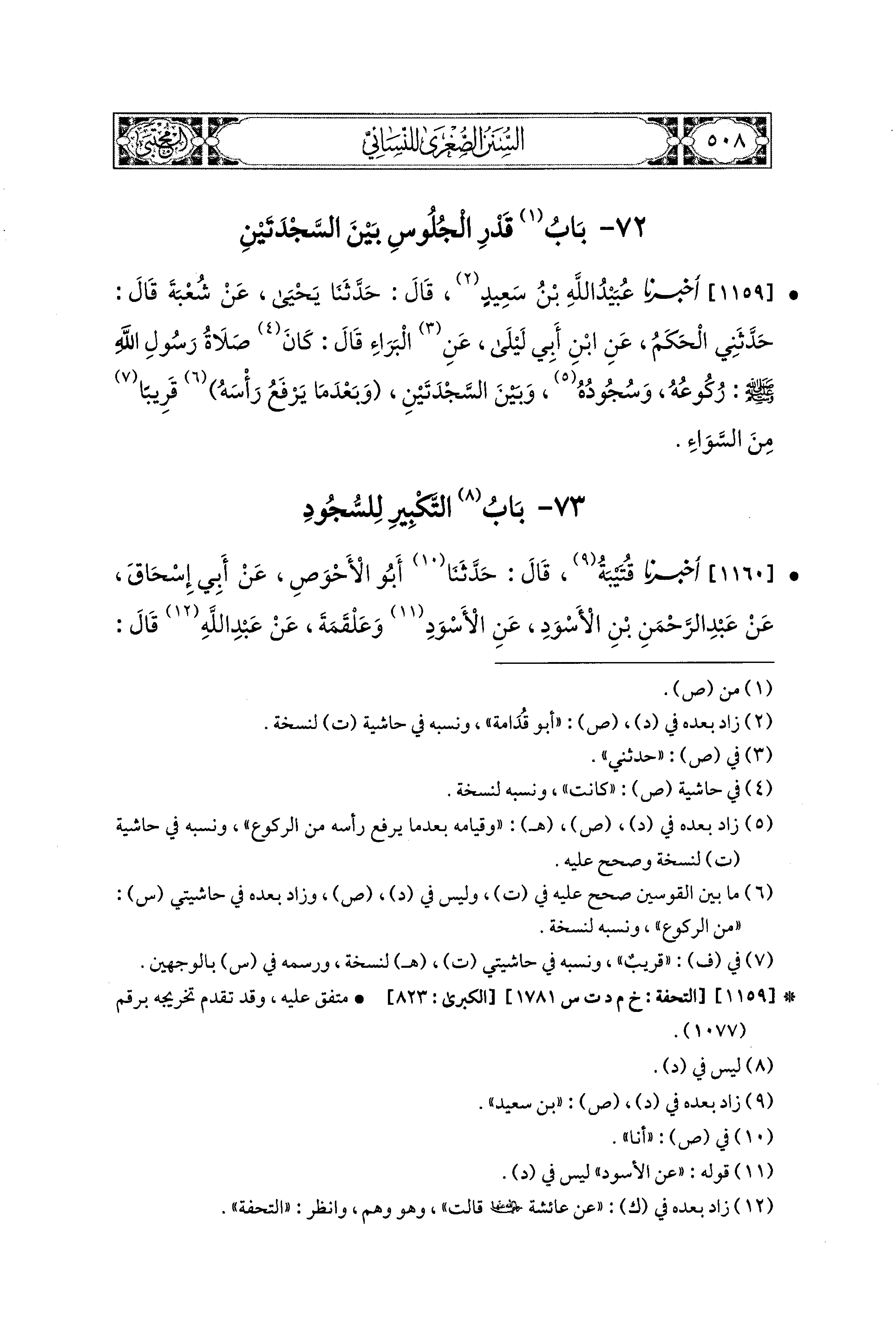 1160- أَخبَرنا قُتَيبَةُ، قال: حَدثنا أَبو الأَحْوَصِ، عَن أَبي إِسحَاقَ، عَن عَبدِ الرَّحْمَنِ بْنِ الأَسْوَدِ، عَنِ الأَسْوَدِ، وَعَلْقَمَةُ، عَن عَبدِ اللهِ قَالَ: كَانَ رَسُولُ اللهِ صَلى الله عَليه وسَلم يُكَبِّرُ فِي كُلِّ رَفْعٍ، وَوَضْعٍ وَقِيَامٍ وَقُعُودٍ، وَأَبو بَكْرٍ، وَعُمَرُ، وَعُثمَانُ رَضِيَ اللهُ عَنهُمْ.
