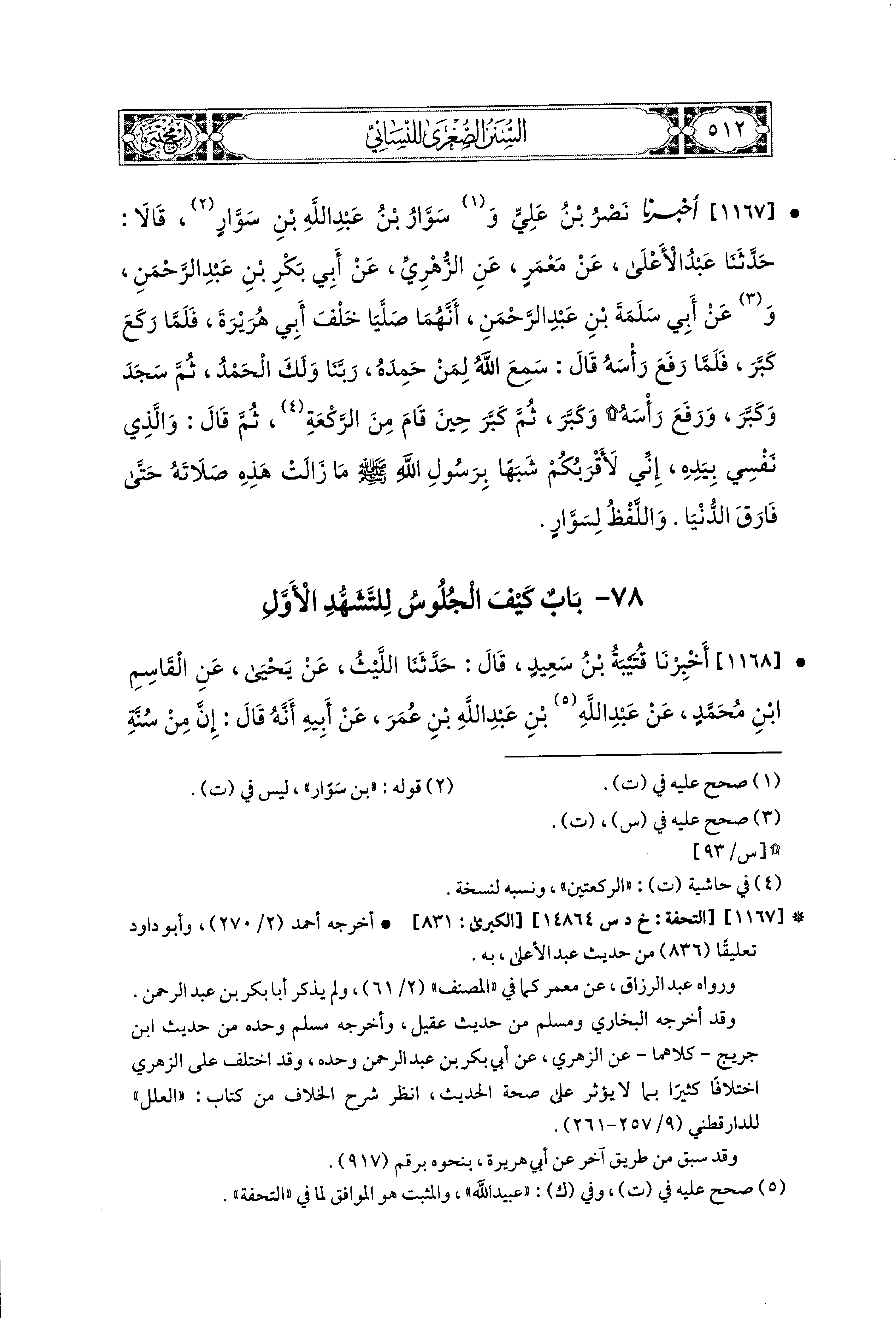 1168- أَخبَرنا قُتَيبَةُ بنُ سَعيدٍ، قال: حَدثنا اللَّيْثُ، عَن يَحيَى، عَنِ القَاسِمِ بْنِ مُحَمدٍ، عَن عَبد اللهِ بن عَبدِ اللهِ بْنِ عُمَرَ، عَن أَبيهِ أَنَّهُ قَالَ: إِنَّ مِنْ سُنَّةِ الصَّلاَةِ أَنْ تُضْجِعَ رِجْلَكَ اليُسْرَى وَتَنْصِبَ اليُمْنَى.