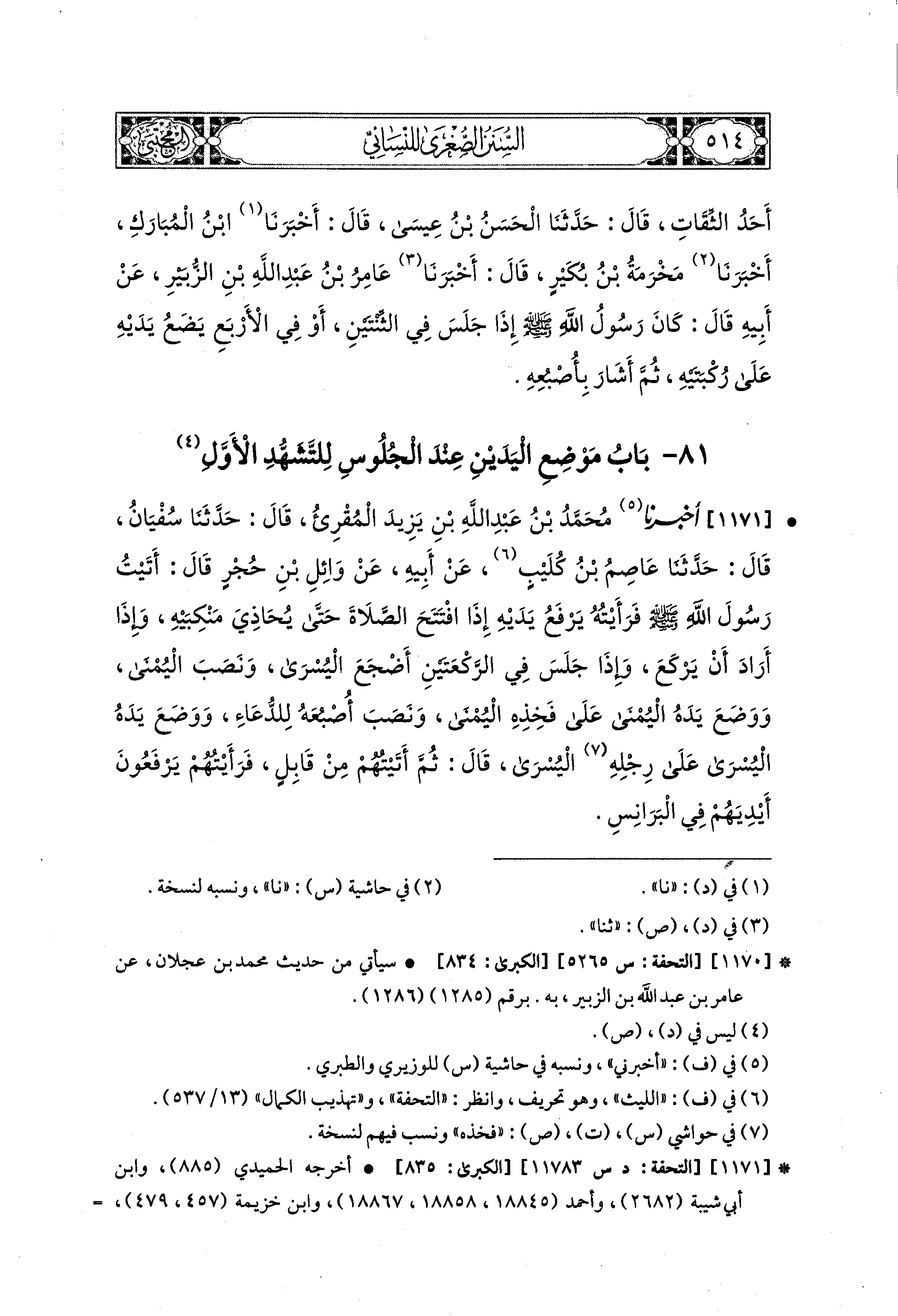 1171- أَخبَرنا مُحَمد بنُ عَبدِ اللهِ بْنِ يَزِيدَ المُقْرِئُ، قال: حَدثنا سُفيَانُ، قال: حَدثنا عَاصِمُ بنُ كُلَيْبٍ، عَن أَبيهِ، عَن وَائِلِ بْنِ حُجْرٍ قَالَ: أَتَيْتُ رَسُولَ اللهِ صَلى الله عَليه وسَلم فَرَأَيْتُهُ يَرْفَعُ يَدَيْهِ إِذَا افْتَتَحَ الصَّلاَةَ حَتَّى يُحَاذِيَ مَنْكِبَيْهِ، وَإِذَا أَرَادَ أَنْ يَرْكَعَ، وَإِذَا جَلَسَ فِي الرَّكْعَتَيْنِ أَضْجَعَ اليُسْرَى وَنَصَبَ اليُمْنَى، وَوَضَعَ يَدَهُ اليُمْنَى عَلَى فَخِذِهِ اليُمْنَى، وَنَصَبَ إِصْبَعَهُ لِلدُّعَاءِ، وَوَضَعَ يَدَهُ اليُسْرَى عَلَى رِجْلِهِ اليُسْرَى، قَالَ: ثُمَّ أَتَيْتُهُمْ مِنْ قَابِلٍ فَرَأَيْتُهُمْ يَرْفَعُونَ أَيْدِيَهُمْ فِي البَرَانِسِ.