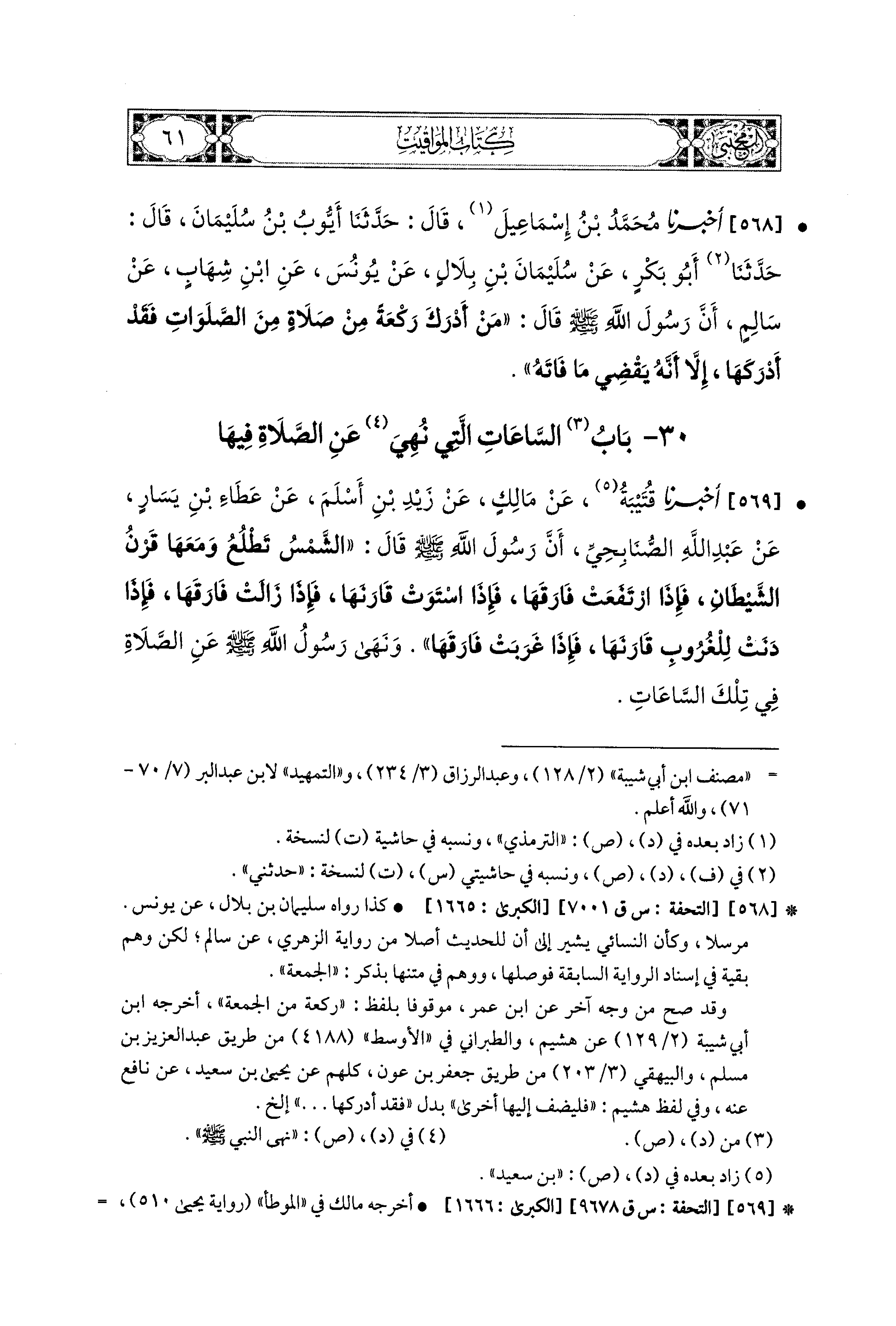 569- أَخبَرنا قُتَيبَةُ، عَن مَالِكٍ، عَن زَيْدِ بْنِ أَسْلَمَ، عَن عَطَاءِ بْنِ يَسَارٍ، عَن عَبدِ اللهِ الصُّنَابِحِيِِّ، أَنَّ رَسُولَ اللهِ صَلى الله عَليه وسَلم قَالَ: الشَّمْسُ تَطْلُعُ وَمَعَهَا قَرْنُ الشَّيْطَانِ، فَإِذَا ارْتَفَعَتْ فَارَقَهَا، فَإِذَا اسْتَوَتْ قَارَنَهَا، فَإِذَا زَالَتْ فَارَقَهَا، فَإِذَا دَنَتْ لِلْغُرُوبِ قَارَنَهَا، فَإِذَا غَرَبَتْ فَارَقَهَا وَنَهَى رَسُولُ اللهِ صَلى الله عَليه وسَلم عَنِ الصَّلاَةِ فِي تِلْكَ السَّاعَاتِ.