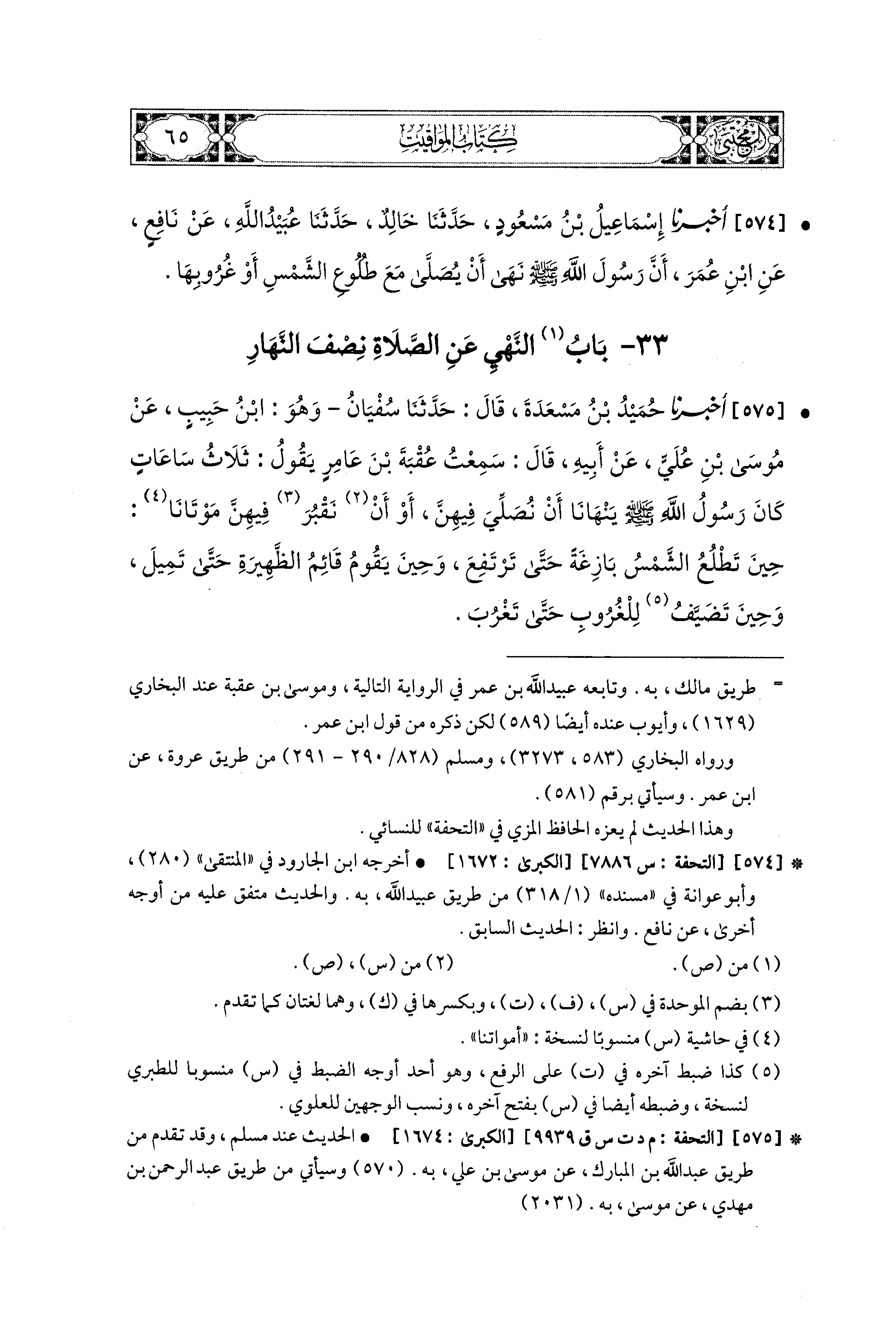 574- أَخبَرنا إِسماعِيلُ بنُ مَسْعُودٍ، حَدَّثَنَا خَالِدٌ، حَدَّثَنَا عُبَيدُ اللهِ، عَن نَافِعٍ، عَنِ ابنِ عُمَرَ، أَنَّ رَسُولَ اللهِ صَلى الله عَليه وسَلم نَهَى أَنْ يُصَلَّى مَعَ طُلُوعِ الشَّمْسِ، أَوْ غُرُوبِهَا.