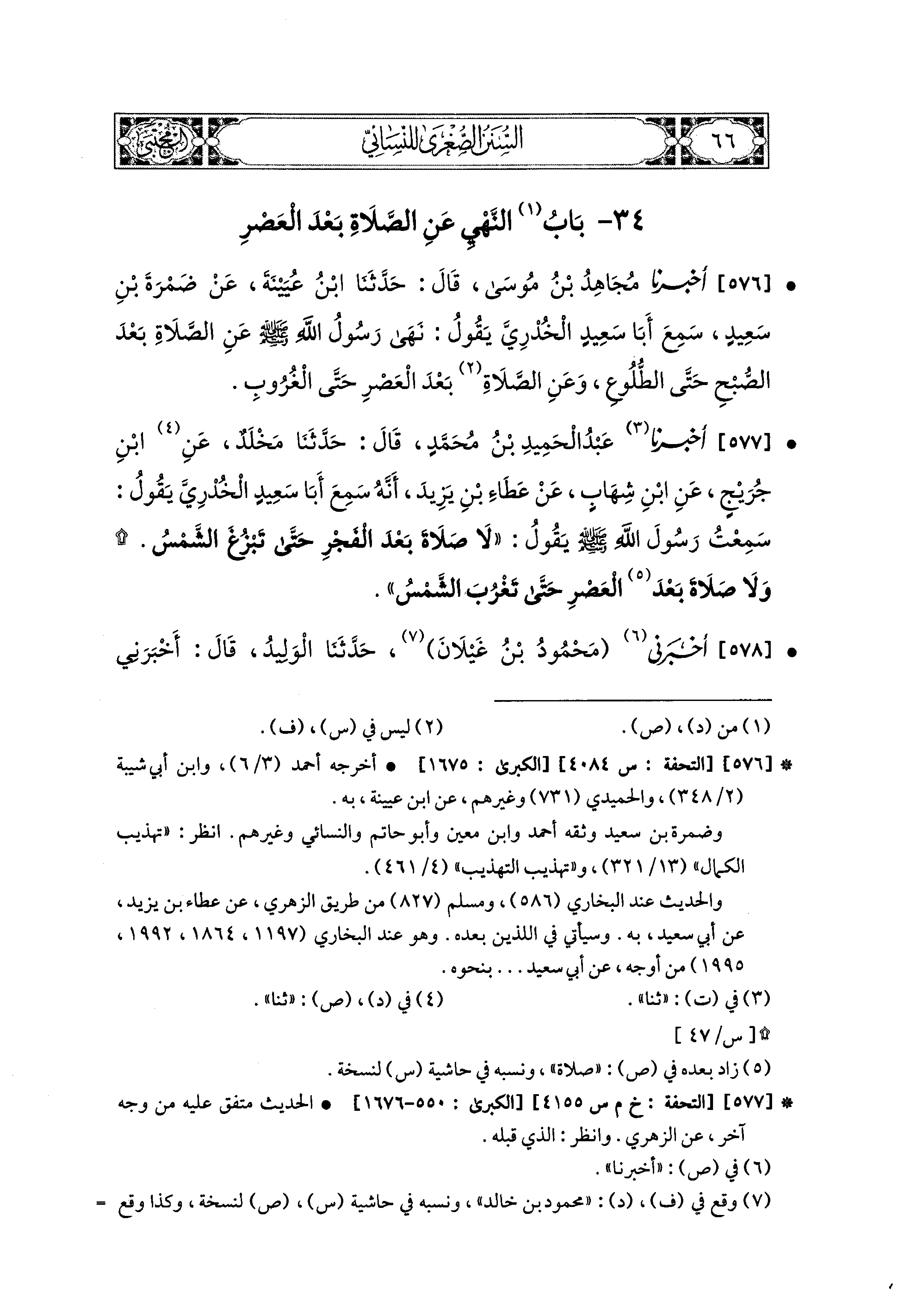 576- أَخبَرنا مُجَاهِدُ بنُ مُوسَى، قال: حَدثنا ابنُ عُيَيْنَةَ، عَن ضَمْرَةَ بْنِ سَعيدٍ، سَمِعَ أَبَا سَعيدٍ الخُدْرِيَّ يَقُولُ: نَهَى رَسُولُ اللهِ صَلى الله عَليه وسَلم عَنِ الصَّلاَةِ بَعْدَ الصُّبْحِ حَتَّى الطُّلُوعِ، وَعَنِ الصَّلاَةِ بَعْدَ العَصْرِ حَتَّى الغُرُوبِ.