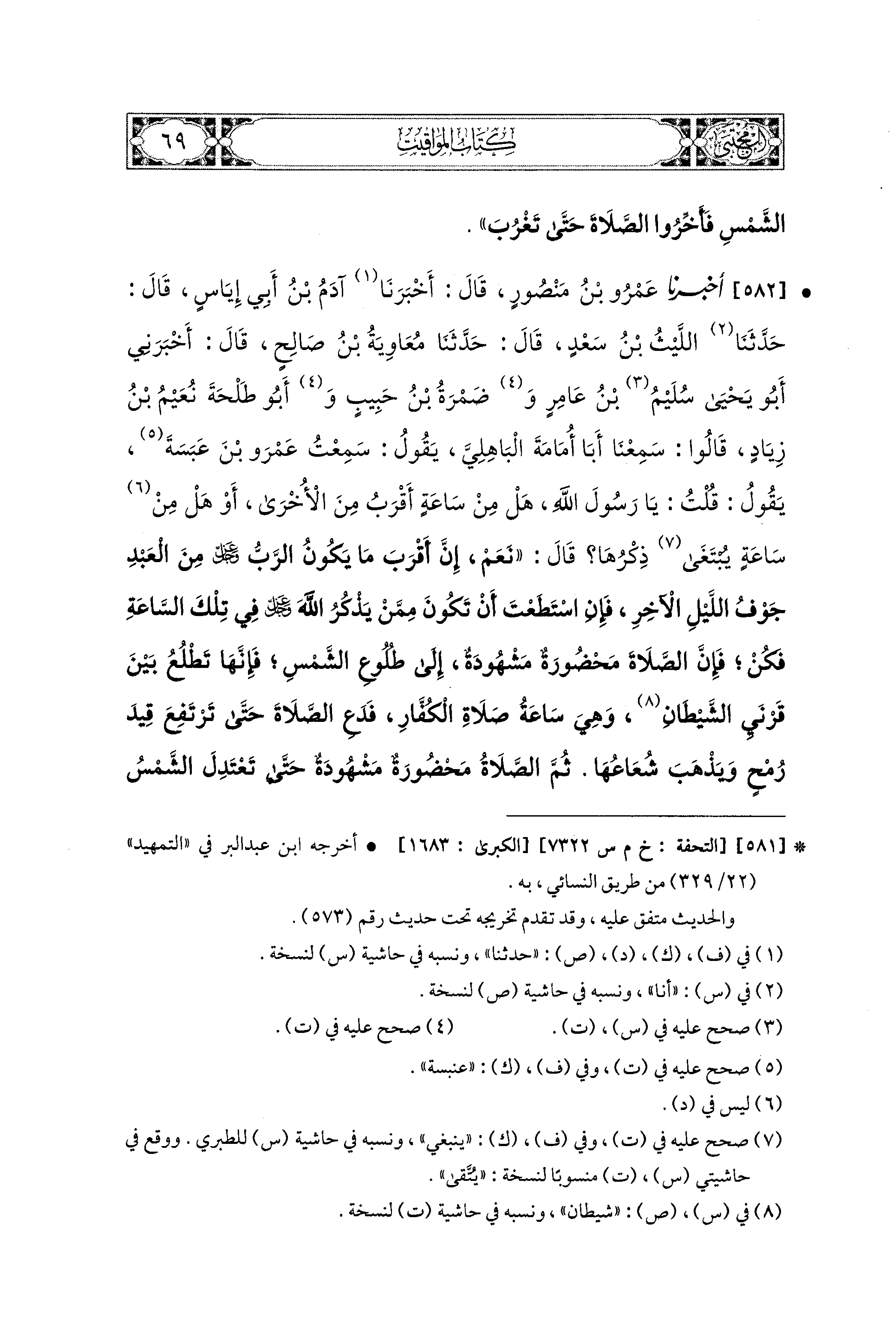 582- أَخبَرنا عَمْرُو بنُ مَنْصُورٍ، قَالَ: أَخبَرنا آدَمُ بنُ أَبي إِيَاسٍ، قال: حَدثنا اللَّيْثُ بنُ سَعْدٍ، قال: حَدثنا مُعَاوِيَةُ بنُ صَالِحٍ، قَالَ: أَخبَرني أَبو يَحيَى سُلَيْمُ بنُ عَامِرٍ، وَضَمْرَةُ بنُ حَبِيبٍ، وَأَبو طَلْحَةَ نُعَيْمُ بنُ زِيَادٍ قَالُوا: سَمِعْنَا أَبَا أُمَامَةَ البَاهِلِيَّ يَقُولُ: سَمِعْتُ عَمْرَو بْنَ عَبَسَةَ يَقُولُ: قُلْتُ يَا رَسُولَ اللهِ، هَلْ مِنْ سَاعَةٍ أَقْرَبُ مِنَ الأُخْرَى، أَوْ هَلْ مِنْ سَاعَةٍ يُبْتَغَى ذِكْرُهَا؟ قَالَ: نَعَمْ، إِنَّ أَقْرَبَ مَا يَكُونُ الرَّبُّ عَزَّ وَجَلَّ مِنَ العَبدِ جَوْفُ اللَّيلِ الآخِرِ، فَإِنِ اسْتَطَعْتَ أَنْ تَكُونَ مِمَّنْ يَذْكُرُ اللهَ عَزَّ وَجَلَّ فِي تِلْكَ السَّاعَةِ فَكُنْ؛ فَإِنَّ الصَّلاَةَ مَحْضُورَةٌ مَشْهُودَةٌ إِلَى طُلُوعِ الشَّمْسِ، فَإِنَّهَا تَطْلُعُ بَيْنَ قَرْنَيِ الشَّيْطَانِ، وَهِيَ سَاعَةُ صَلاَةِ الكُفَّارِ، فَدَعِ الصَّلاَةَ حَتَّى تَرْتَفِعَ قِيدَ رُمْحٍ وَيَذْهَبَ شُعَاعُهَا، ثُمَّ الصَّلاَةُ مَحْضُورَةٌ مَشْهُودَةٌ حَتَّى تَعْتَدِلَ الشَّمْسُ اعْتِدَالَ الرُّمْحِ بِنِصْفِ النَّهَارِ؛ فَإِنَّهَا سَاعَةٌ تُفْتَحُ فِيهَا أَبْوَابُ جَهَنَّمَ وَتُسْجَرُ، فَدَعِ الصَّلاَةَ حَتَّى يَفِيءَ الفَيْءُ، ثُمَّ الصَّلاَةُ مَحْضُورَةٌ مَشْهُودَةٌ حَتَّى تَغِيبَ الشَّمْسُ؛ فَإِنَّهَا تَغِيبُ بَيْنَ قَرْنَيْ الشَيْطَانٍ وَهِيَ صَلاَةُ الكُفَّارِ.