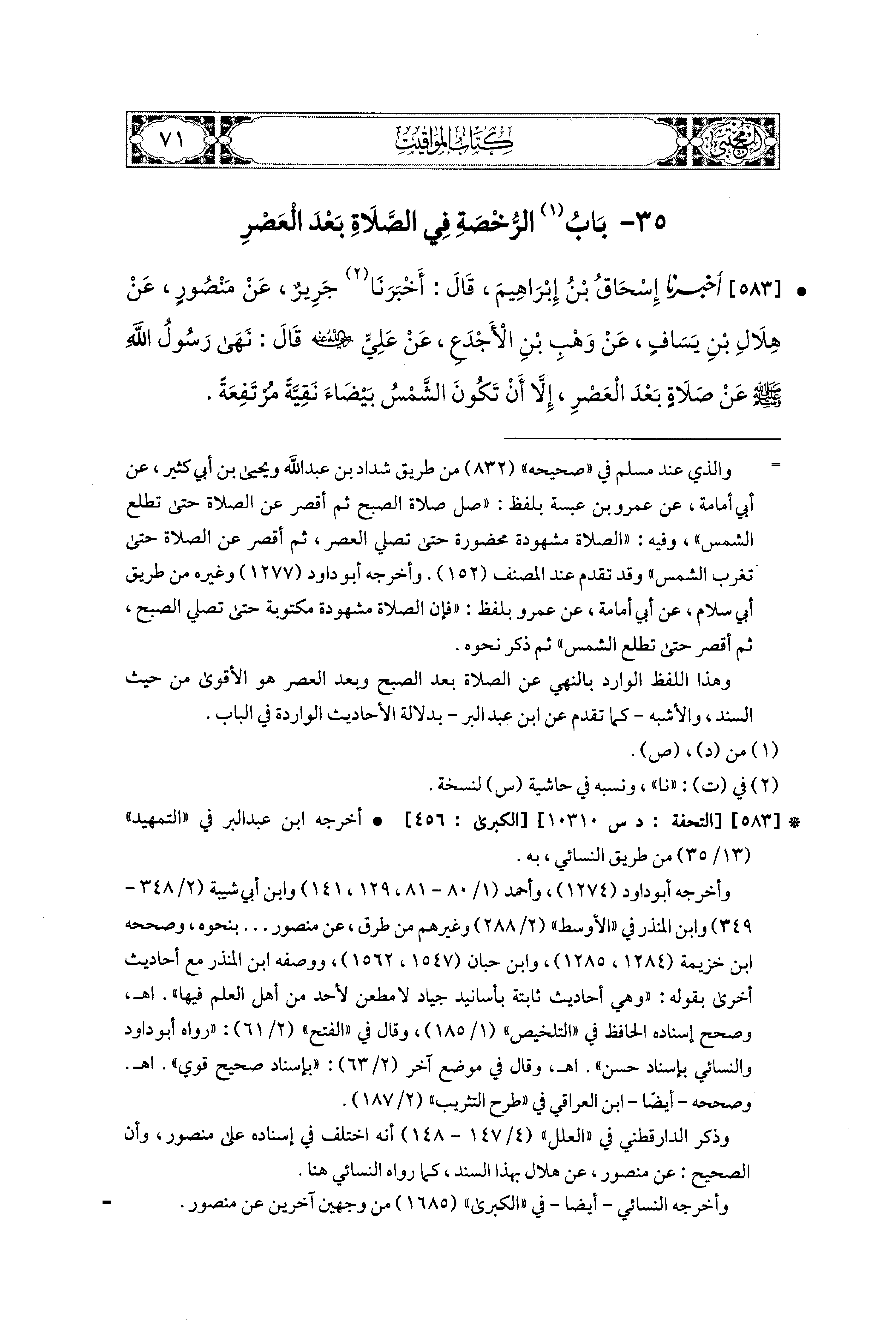 583- أَخبَرنا إِسحَاقُ بنُ إِبراهِيمَ، قال: أَخبَرَنا جَرِيرٌ، عَن مَنْصُورٍ، عَن هِلاَلِ بْنِ يَسَافٍ، عَن وَهْبِ بْنِ الأَجْدَعِ، عَن عَلِيٍّ رَضِيَ اللهُ عَنهُ قَالَ: نَهَى رَسُولُ اللهِ صَلى الله عَليه وسَلم عَنِ صَّلاَةِ بَعْدَ العَصْرِ إِلاَّ أَنْ تَكُونَ الشَّمْسُ بَيْضَاءَ نَقِيَّةً مُرْتَفِعَةً.