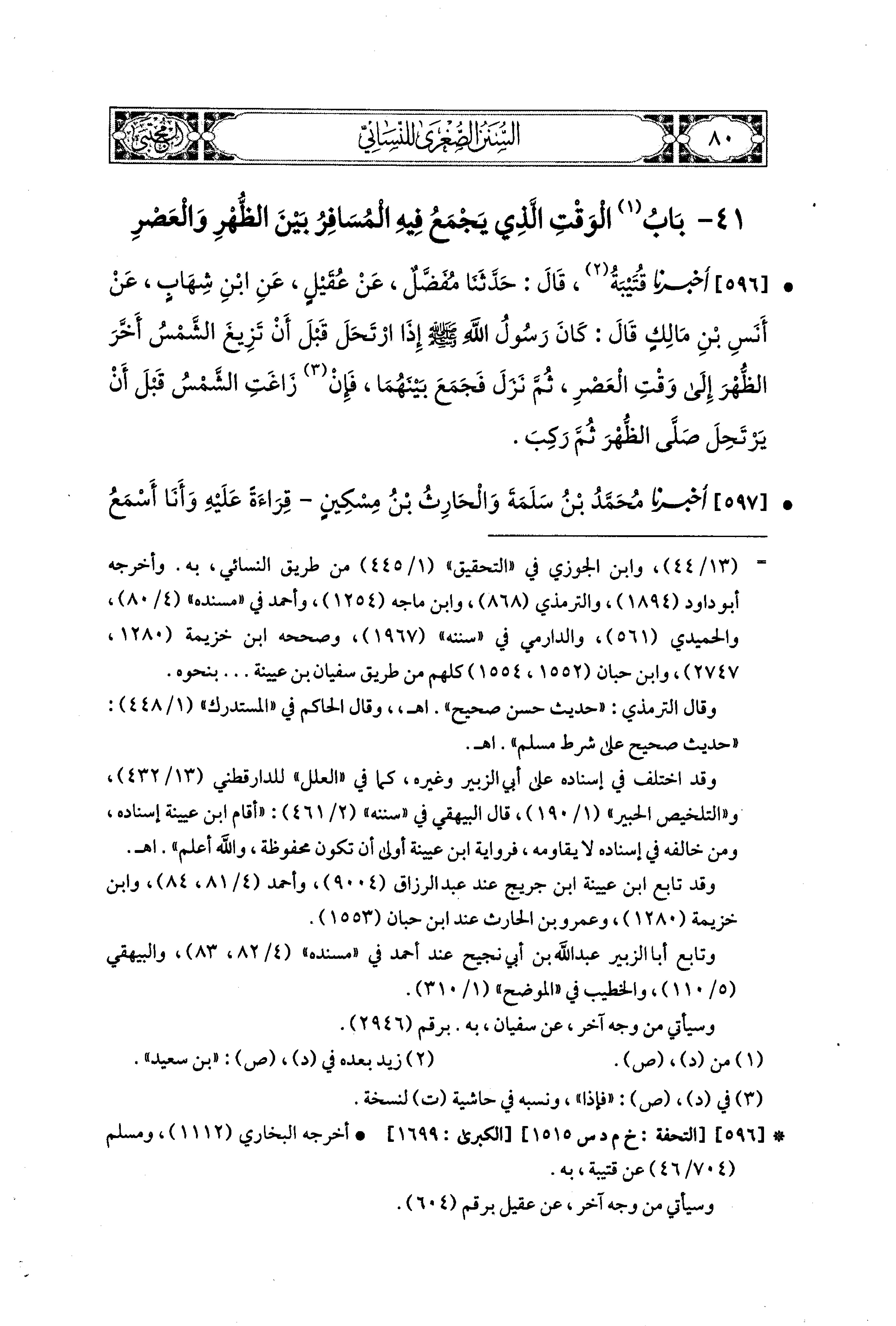 596- أَخبَرنا قُتَيبَةُ، قال: حَدثنا مُفَضَّلٌ، عَن عُقَيْلٍ، عَنِ ابنِ شِهَابٍ، عَن أَنَسِ بْنِ مَالِكٍ قَالَ: كَانَ رَسُولُ اللهِ صَلى الله عَليه وسَلم إِذَا ارْتَحَلَ قَبْلَ أَنْ تَزِيغَ الشَّمْسُ أَخَّرَ الظُّهْرَ إِلَى وَقْتِ العَصْرِ، ثُمَّ نَزَلَ فَجَمَعَ بَيْنَهُمَا، فَإِنْ زَاغَتِ الشَّمْسُ قَبْلَ أَنْ يَرْتَحِلَ صَلَّى الظُّهْرَ، ثُمَّ رَكِبَ.