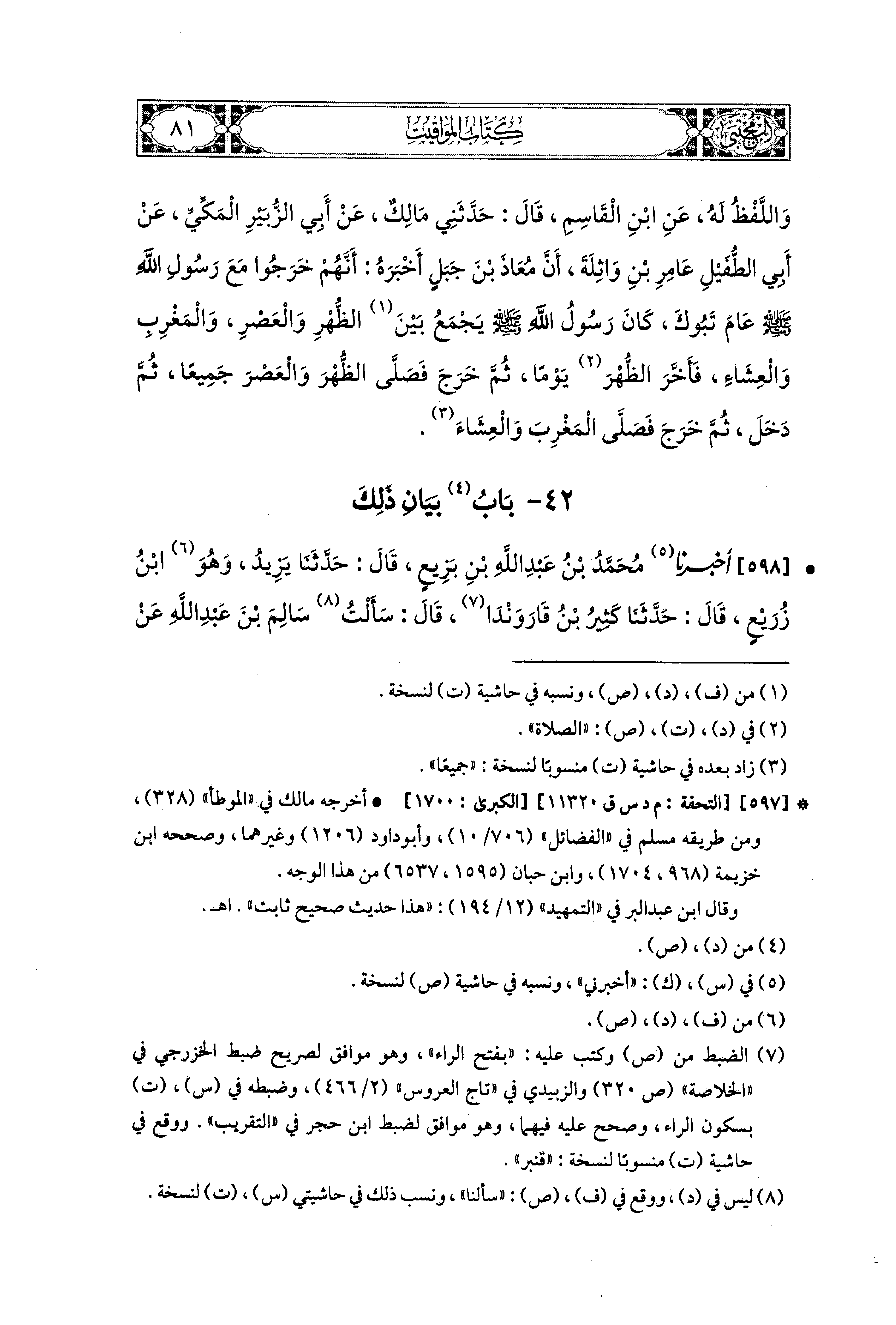 598- أَخبَرنا مُحَمد بنُ عَبدِ اللهِ بْنِ بَزِيعٍ، قال: حَدثنا يَزِيدُ وهو ابنُ زُرَيْعٍ، قال: حَدثنا كَثِيرُ بنُ قَارَوَنْدَا قَالَ: سَأَلْتُ سَالِمَ بْنَ عَبدِ اللهِ عَن صَلاَةِ أَبيهِ فِي السَّفَرِ، وَسَأَلْنَاهُ هَلْ كَانَ يَجْمَعُ بَيْنَ شَيْءٍ مِنْ صَلاَتِهِ فِي سَفَرِهِ؟ فَذَكَرَ أَنَّ صَفِيَّةَ بِنْتَ أَبي عُبَيدٍ كَانَتْ تَحْتَهُ، فَكَتَبَتْ إِلَيْهِ وَهُوَ فِي زَرَّاعَةٍ لَهُ: إِنِّي فِي آخِرِ يَوْمٍ مِنْ أَيَّامِ الدُّنْيَا، وَأَوَّلِ يَوْمٍ مِنَ الآخِرَةِ، فَرَكِبَ فَأَسْرَعَ السَّيْرَ إِلَيْهَا حَتَّى إِذَا حَانَتْ صَلاَةُ الظُّهْرِ قَالَ لَهُ المُؤَذِّنُ: الصَّلاَةَ يَا أَبَا عَبدِ الرَّحْمَنِ، فَلَمْ يَلْتَفِتْ حَتَّى إِذَا كَانَ بَيْنَ الصَّلاَتَيْنِ نَزَلَ فَقَالَ: أَقِمْ، فَإِذَا سَلَّمْتُ فَأَقِمْ فَصَلَّى، ثُمَّ رَكِبَ حَتَّى إِذَا غَابَتِ الشَّمْسُ قَالَ لَهُ المُؤَذِّنُ: الصَّلاَةَ، فَقَالَ: كَفِعْلِكَ فِي صَلاَةِ الظُّهْرِ وَالعَصْرِ، ثُمَّ سَارَ حَتَّى إِذَا اشْتَبَكَتِ النُّجُومُ نَزَلَ، ثُمَّ قَالَ لِلْمُؤَذِّنِ: أَقِمْ، فَإِذَا سَلَّمْتُ فَأَقِمْ فَصَلَّى، ثُمَّ انْصَرَفَ، فَالتَفَتَ إِلَيْنَا، وَقَالَ: قَالَ رَسُولُ اللهِ صَلى الله عَليه وسَلم: إِذَا حَضَرَ أَحَدَكُمُ الأَمْرُ الَّذِي يَخَافُ فَوْتَهُ فَلْيُصَلِّ هَذِهِ الصَّلاَةَ.