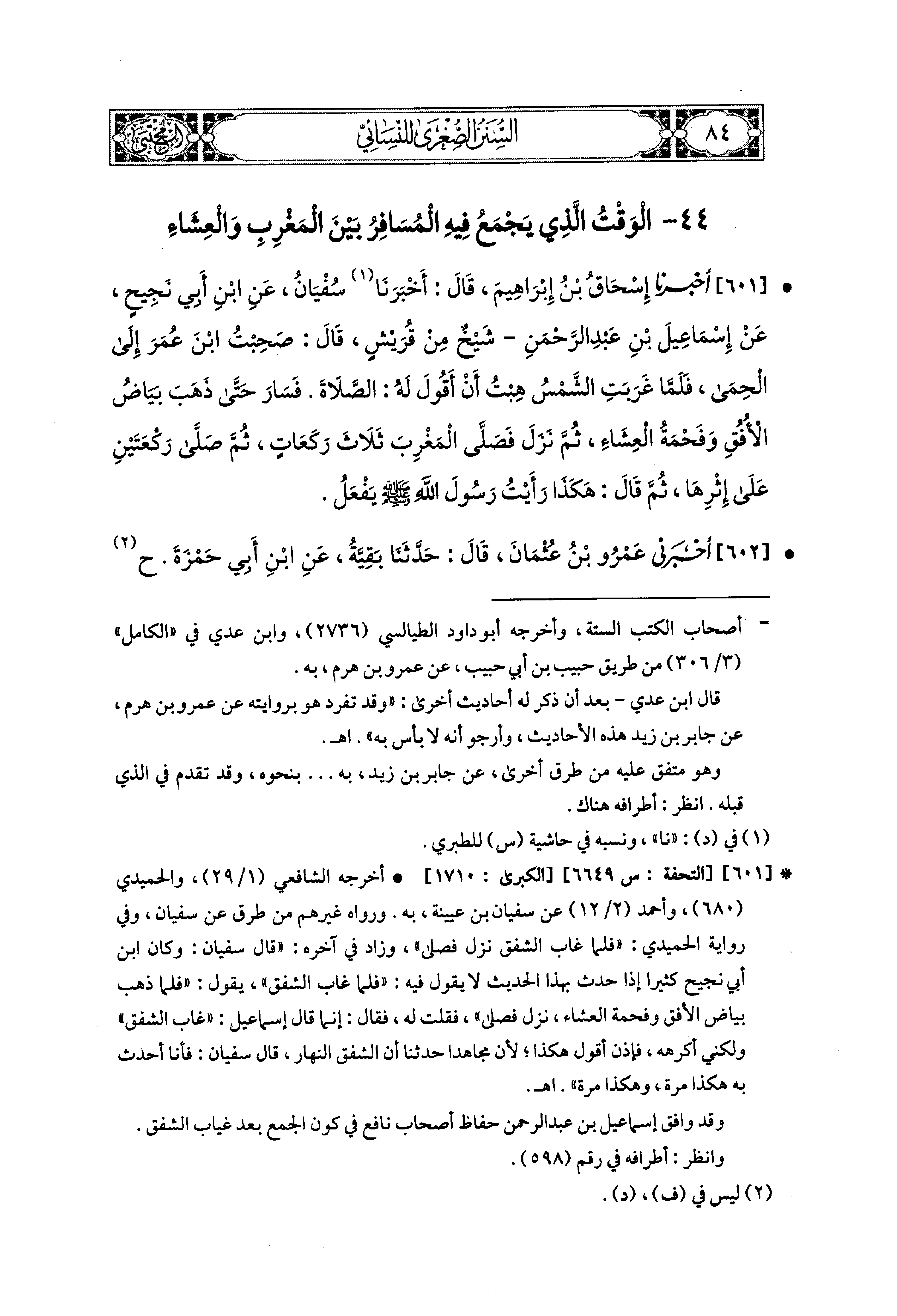 601- أَخْبَرَنا إِسحَاقُ بنُ إِبراهِيمَ، قَالَ: أَخبَرنا سُفيَانُ، عَنِ ابنِ أَبي نَجِيحٍ، عَن إِسماعِيلَ بْنِ عَبدِ الرَّحْمَنِ شَيْخٍ مِنْ قُرَيْشٍ قَالَ: صَحِبْتُ ابنَ عُمَرَ إِلَى الحِمَى، فَلَمَّا غَرَبَتِ الشَّمْسُ هِبْتُ أَنْ أَقُولَ لَهُ الصَّلاَةَ فَسَارَ حَتَّى ذَهَبَ بَيَاضُ الأُفُقِ وَفَحْمَةُ العِشَاء، ثُمَّ نَزَلَ فَصَلَّى المَغْرِبَ ثَلاَثَ رَكَعَاتٍ، ثُمَّ صَلَّى رَكْعَتَيْنِ عَلَى إِثْرِهَا، ثُمَّ قَالَ: هَكَذَا رَأَيْتُ رَسُولَ اللهِ صَلى الله عَليه وسَلم يَفْعَلُ.