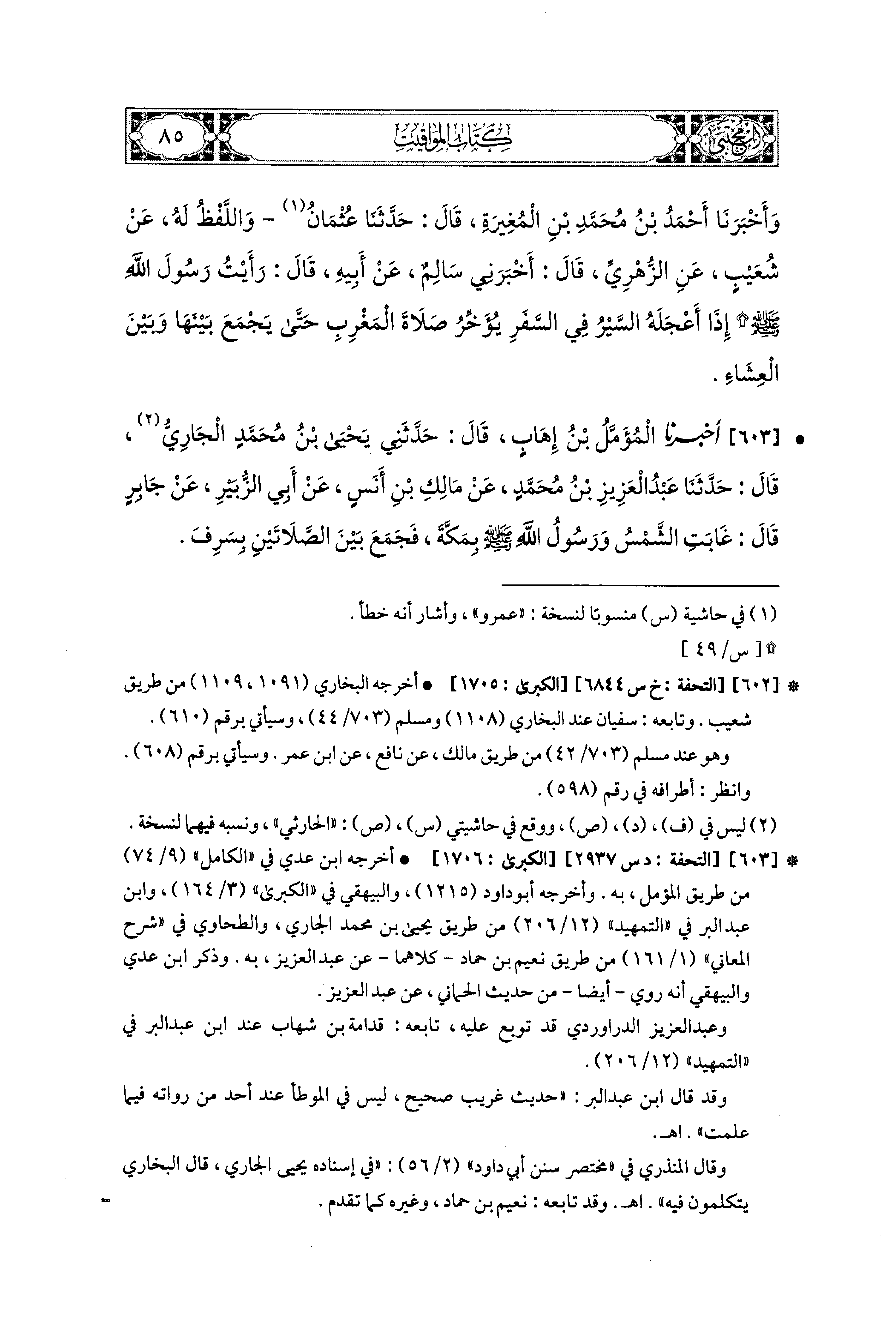 603- أَخبَرنا المُؤَمَّلُ بنُ إِهَابٍ، قَالَ: حَدَّثَني يَحيَى بنُ مُحَمدٍ الجَارِيُّ، قال: حَدثنا عَبدُ العَزِيزِ بنُ مُحَمدٍ، عَن مَالِكِ بْنِ أَنَسٍ، عَن أَبي الزُّبَيْرِ، عَن جَابِرٍ قَالَ: غَابَتِ الشَّمْسُ وَرَسُولُ اللهِ صَلى الله عَليه وسَلم بِمَكَّةَ فَجَمَعَ بَيْنَ الصَّلاَتَيْنِ بِسَرِفَ.