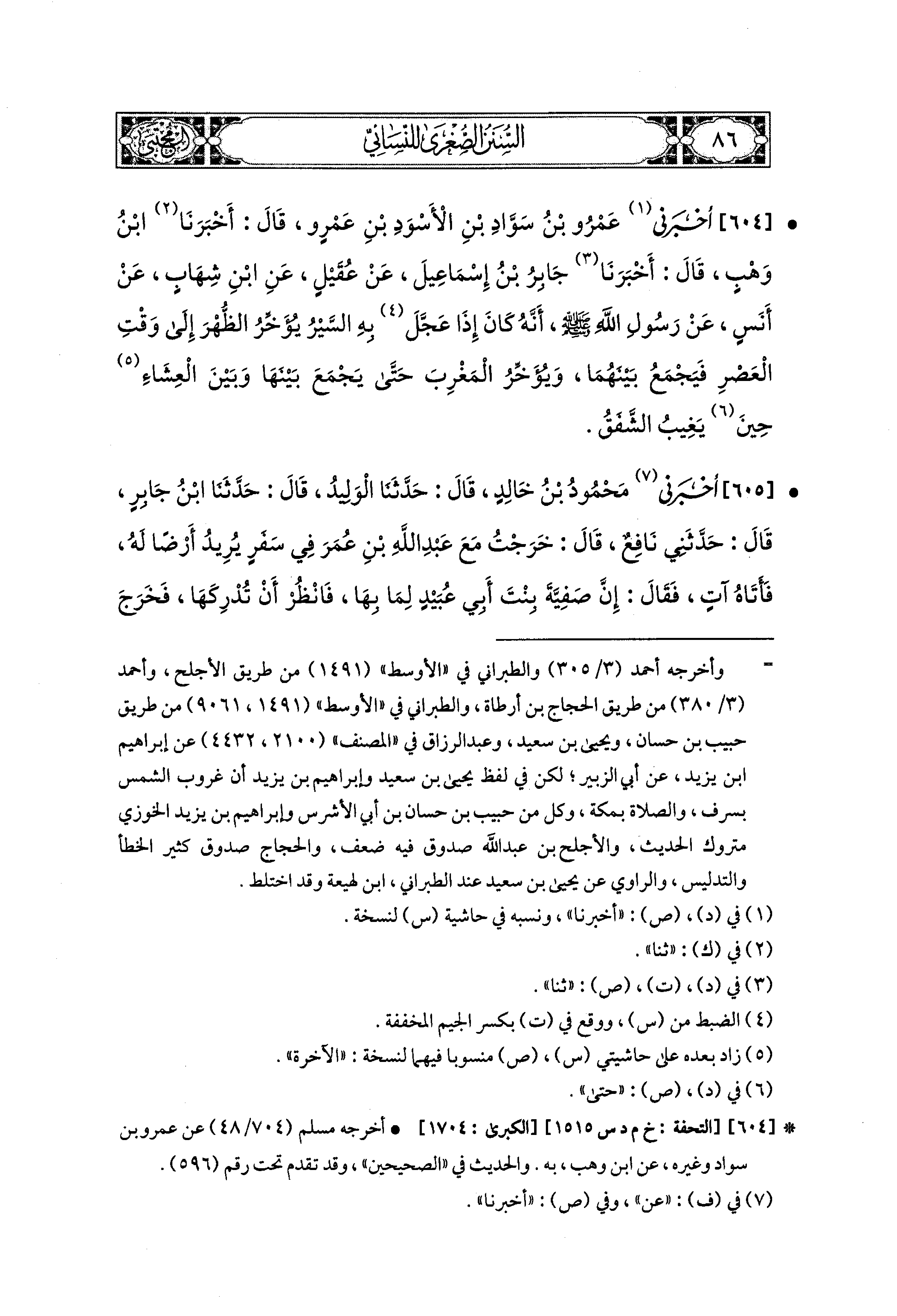 604- أَخبَرني عَمْرُو بنُ سَوَّادِ بْنِ الأَسْوَدِ بْنِ عَمْرٍو، قَالَ: أَخبَرنا ابنُ وَهْبٍ، قال: أَخبَرنا جَابِرُ بنُ إِسماعِيلَ، عَن عُقَيْلٍ، عَنِ ابنِ شِهَابٍ، عَن أَنَسٍ، عَن رَسُولِ اللهِ صَلى الله عَليه وسَلم؛ أَنَّهُ كَانَ إِذَا عَجِلَ بِهِ السَّيْرُ يُؤَخِّرُ الظُّهْرَ إِلَى وَقْتِ العَصْرِ فَيَجْمَعُ بَيْنَهُمَا، وَيُؤَخِّرُ المَغْرِبَ حَتَّى يَجْمَعَ بَيْنَهَا وَبَيْنَ العِشَاء حين يَغِيبَ الشَّفَقُ.