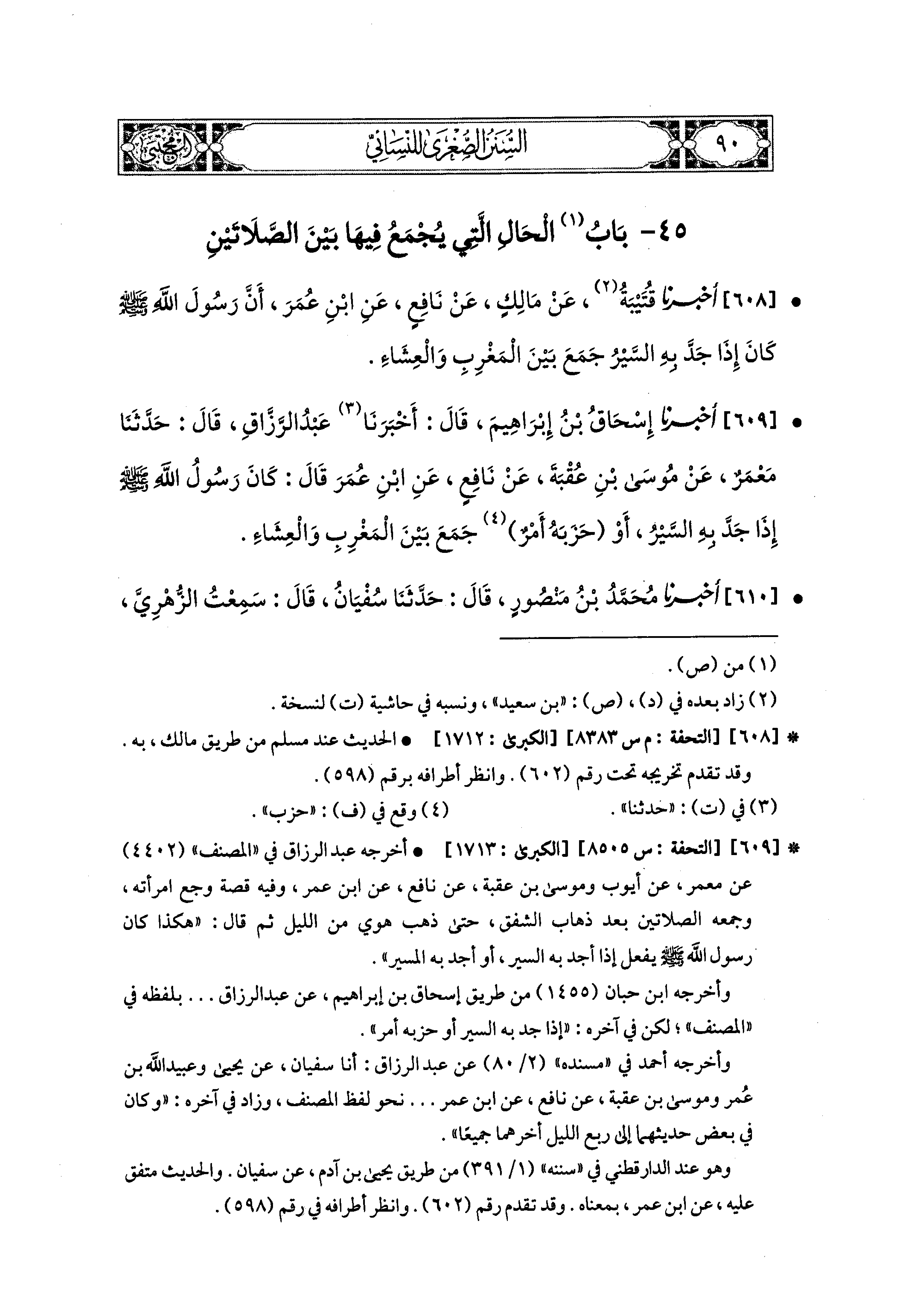 609- أَخبَرنا إِسحَاقُ بنُ إِبراهِيمَ، قَالَ: أَخبَرنا عَبدُ الرَّزَّاقِ، قال: حَدثنا مَعْمَرٌ، عَن مُوسَى بْنِ عُقْبَةَ، عَن نَافِعٍ، عَنِ ابنِ عُمَرَ قَالَ: كَانَ رَسُولُ اللهِ صَلى الله عَليه وسَلم إِذَا جَدَّ بِهِ السَّيْرُ، أَوْ حَزَبَهُ أَمْرٌ جَمَعَ بَيْنَ المَغْرِبِ وَالعِشَاء.