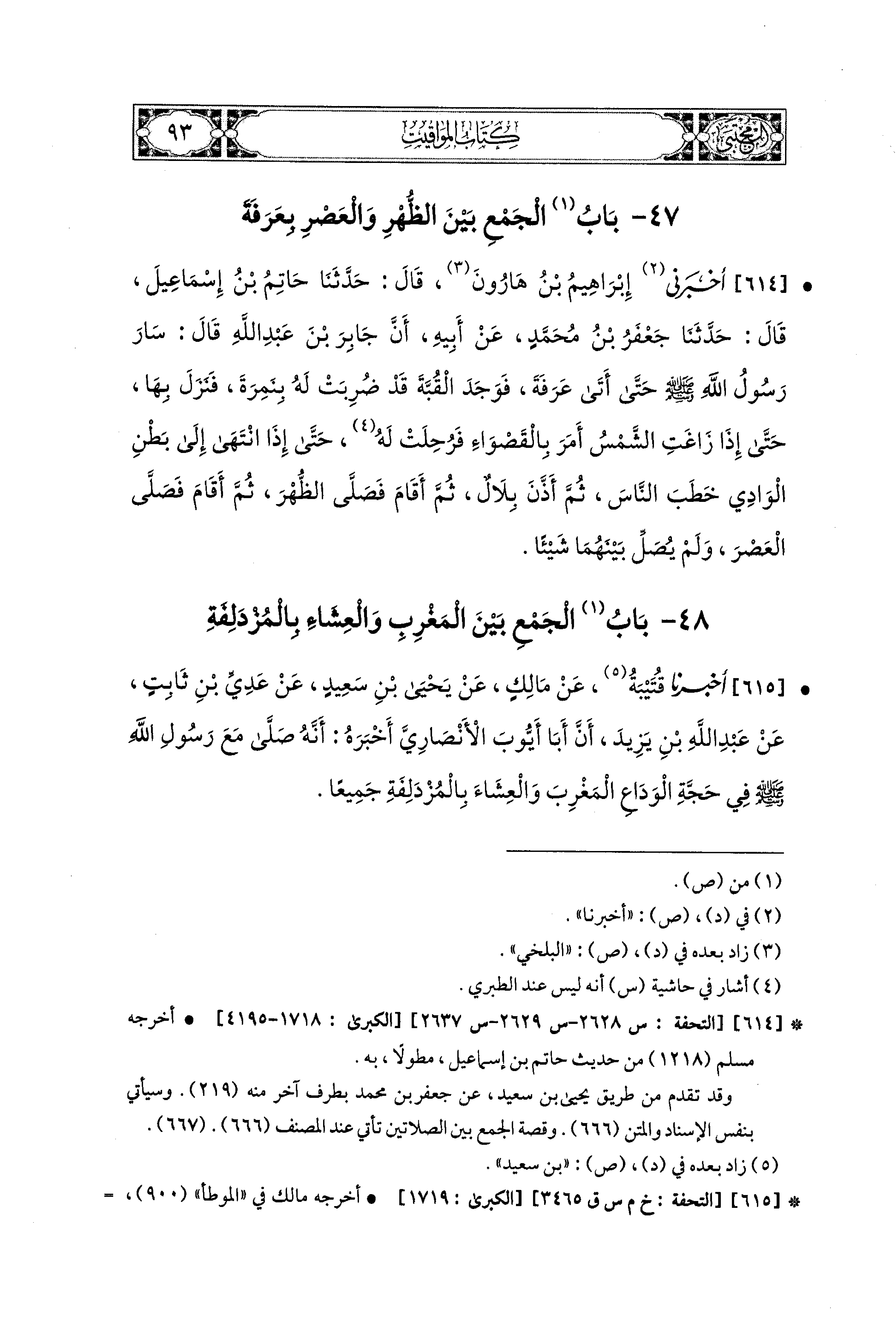 614- أَخبَرني إِبراهِيمُ بنُ هَارُونَ، قال: حَدثنا حَاتِمُ بنُ إِسماعِيلَ، قال: حَدثنا جَعْفَرُ بنُ مُحَمدٍ، عَن أَبيهِ، أَنَّ جَابِرَ بْنَ عَبدِ اللهِ قَالَ: سَارَ رَسُولُ اللهِ صَلى الله عَليه وسَلم حَتَّى أَتَى عَرَفَةَ، فَوَجَدَ القُبَّةَ قَدْ ضُرِبَتْ لَهُ بِنَمِرَةَ فَنَزَلَ بِهَا، حَتَّى إِذَا زَاغَتِ الشَّمْسُ أَمَرَ بِالقَصْوَاءِ فَرُحِلَتْ لَهُ، حَتَّى إِذَا انْتَهَى إِلَى بَطْنِ الوَادِي خَطَبَ النَّاسَ، ثُمَّ أَذَّنَ بِلاَلٌ، ثُمَّ أَقَامَ فَصَلَّى الظُّهْرَ، ثُمَّ أَقَامَ فَصَلَّى العَصْرَ، وَلَمْ يُصَلِّ بَيْنَهُمَا شَيْئًا.