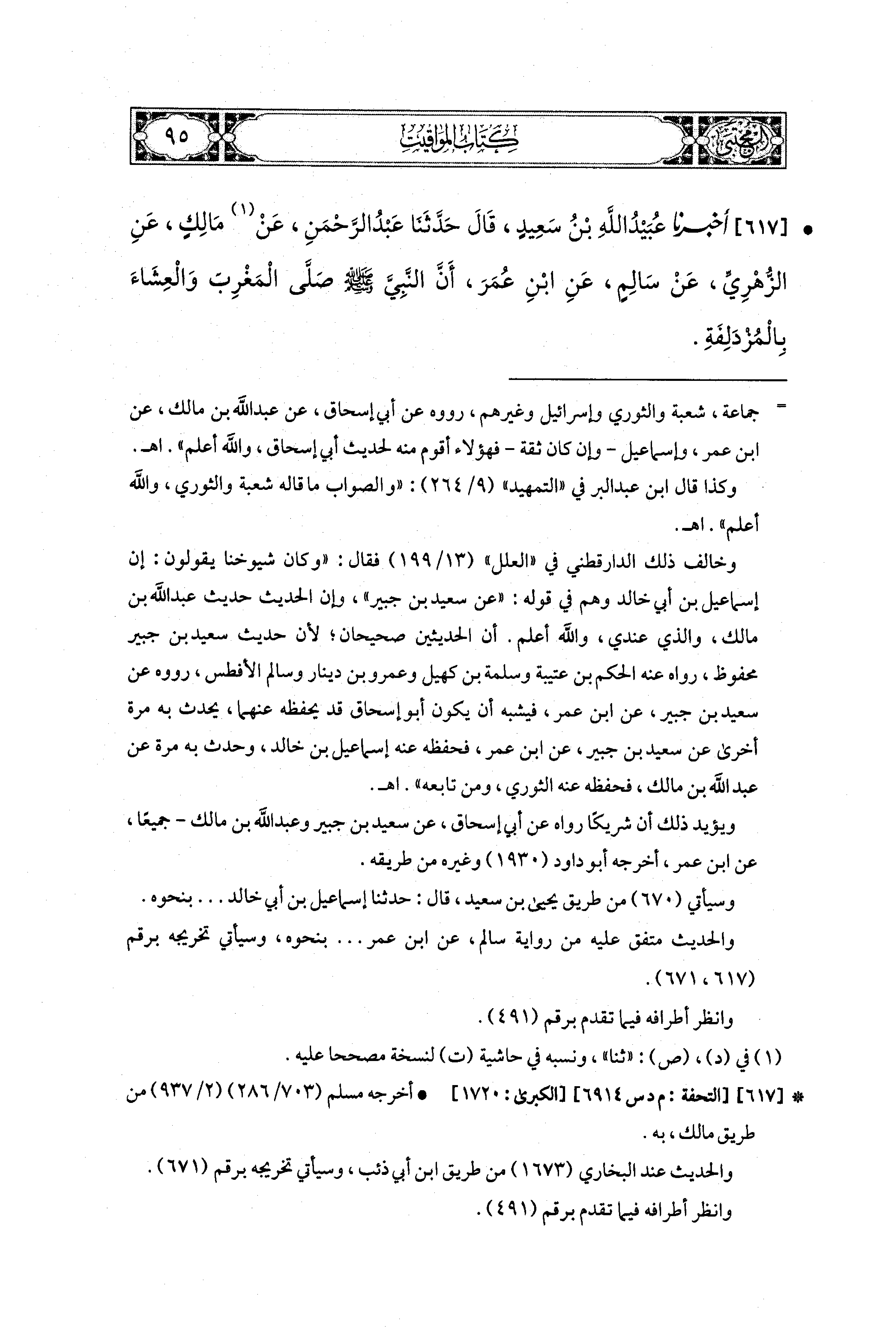 617- أَخبَرنا عُبَيدُ اللهِ بنُ سَعيدٍ، قال: حَدثنا عَبدُ الرَّحْمَنِ، عَن مَالِكٍ، عَنِ الزُّهْرِيِّ، عَن سَالِمٍ، عَنِ ابنِ عُمَرَ، أَنَّ النَّبيَّ صَلى الله عَليه وسَلم صَلَّى المَغْرِبَ وَالعِشَاء بِالمُزْدَلِفَةِ.