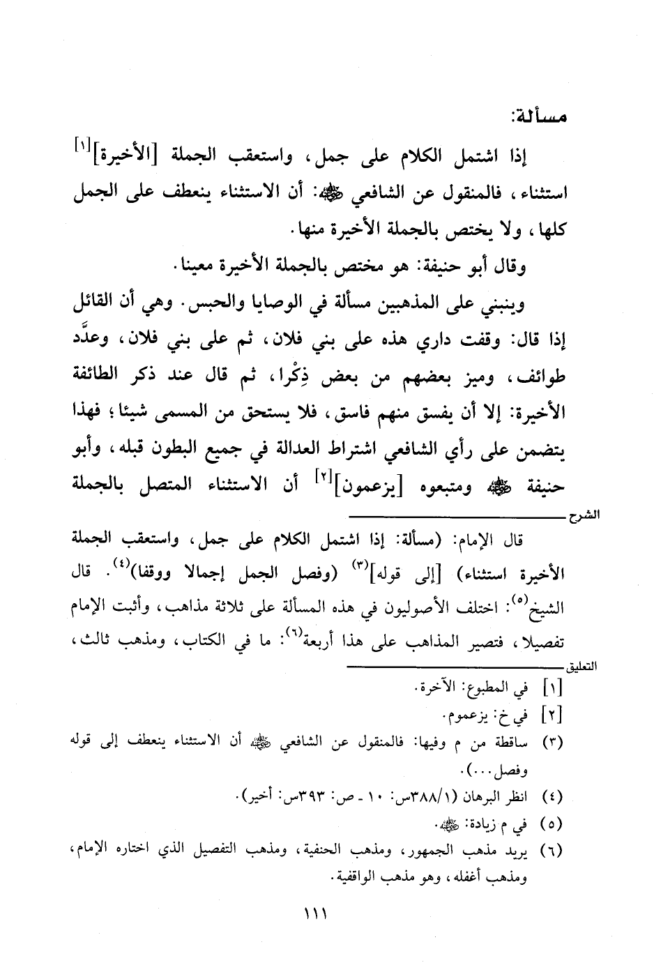 قال الإمام: (مسألة: إذا اشتمل الكلام على جمل، واستعقب الجملة الأخيرة استثناء) [إلى قوله] (وفصل الجمل إجمالا ووقفا). قال الشيخ: اختلف الأصوليون في هذه المسألة على ثلاثة مذاهب، وأثبت الإمام تفصيلا، فتصير المذاهب على هذا أربعة: ما في الكتاب، ومذهب ثالث،