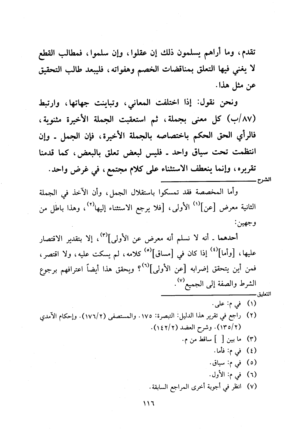 أحدهما- أنه لا نسلم انه معرض عن الأولى]، إلا بتقدير الاقتصار عليها، [وأما] إذا كان في [مساق] كلامه، لم يسكت عليه، ولا اقتصر، فمن أين يتحقق إضرابه [عن الأولى]؟ ويحقق هذا أيضًا اعترافهم برجوع الشرط والصفة إلى الجميع.