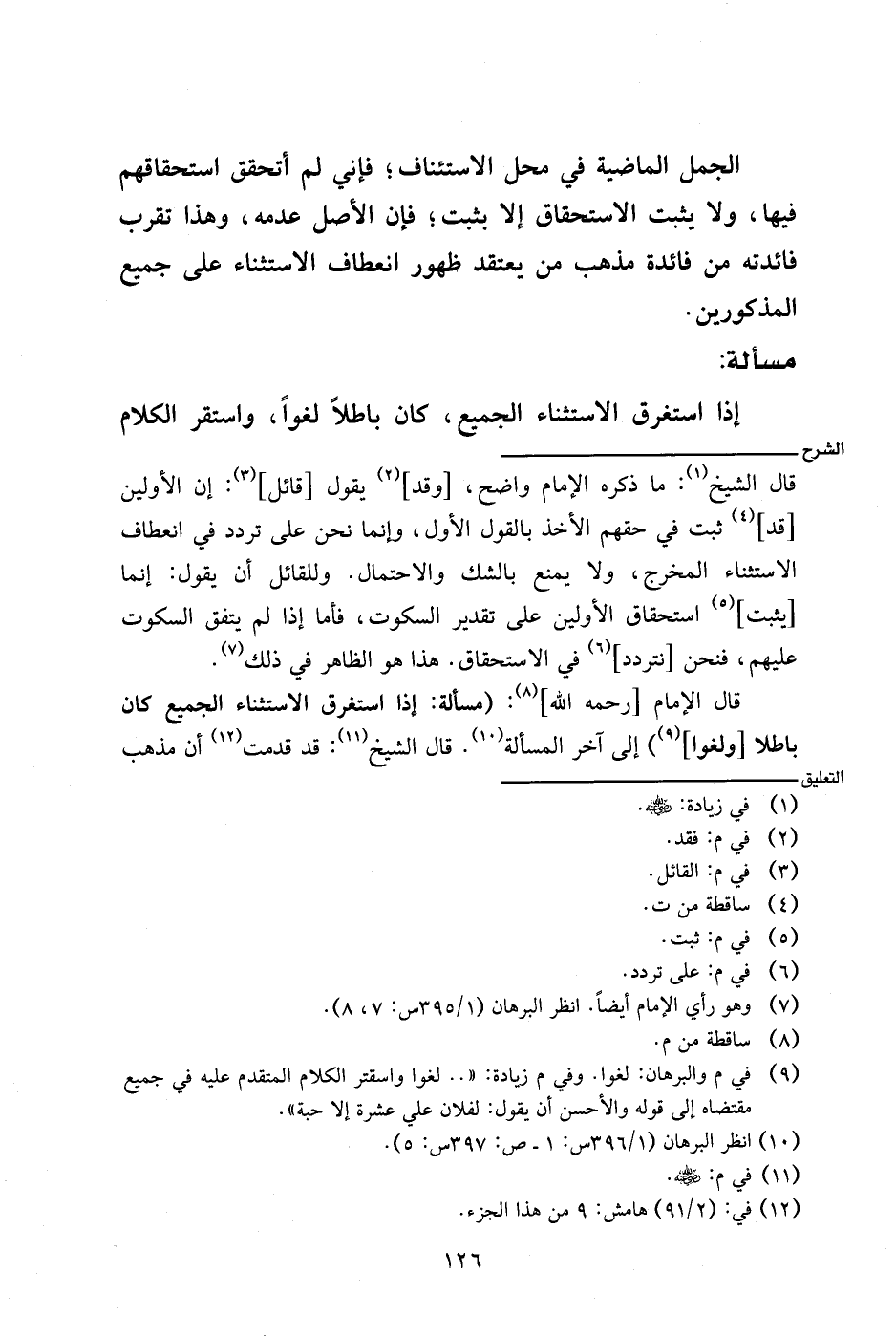 قال الإمام [رحمه الله]: (مسألة: إذا استغرق الاستثناء الجميع كان باطلا [ولغوا] إلى آخر المسألة. قال الشيخ: قد قدمت أن مذهب