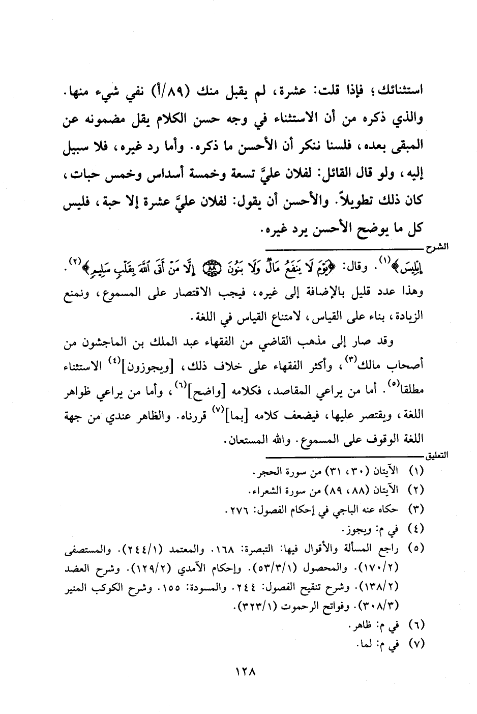 وقد صار إلى مذهب القاضي من الفقهاء عبد الملك بن الماجشون من أصحاب مالك، وأكثر الفقهاء على خلاف ذلك، [ويجوزون] الاستثناء مطلقا. أما من يراعي المقاصد، فكرمه [واضح]، وأما من يراعي ظواهر اللغة، ويقتصر عليها، فيضعف كلامه [بما] قررناه. والظاهر عندي من جهة اللغة الوقوف على المسموع. والله المستعان.
