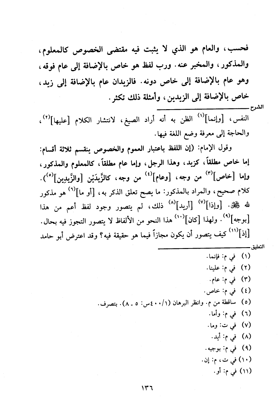 وقول الإمام: (إن اللفظ باعتبار العموم والخصوص ينقسم ثلاثة أقسام: إما خاص مطلقًا، كزيد، وهذا الرجل، وإما عام مطلقًا، كالمعلوم والمذكور، وإما [خاص] من وجه، [وعام] من وجه، كالزَّيدَيْن [والزَّيدِين]). كلام صحيح، والمراد بالمذكور: ما يصح تعلق الذكر به، [أو ما] هو مذكور لله عز وجل. [وإذا] [أريد] ذلك، لم يتصور وجود لفظ أعم من هذا [بوجه]. ولهذا [كان] هذا النحو من الألفاظ لا يتصور التجوز فيه بحال. [إذ] كيف يتصور أن يكون مجازًا فيما هو حقيقة فيه؟ وقد اعترض أبو حامد