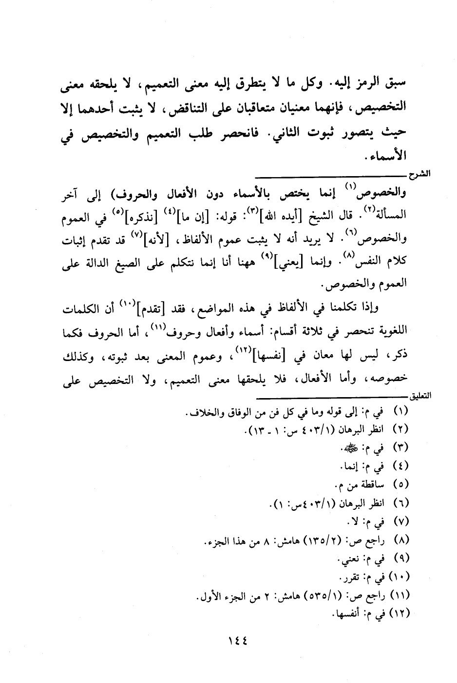 والخصوص إنما يختص بالأسماء دون الفعال والحروف) إلى آخر المسألة. قال الشيخ [أيده الله]: قوله: [إن ما] [نذكره] في العموم والخصوص. لا يريد أنه لا يثبت عموم الألفاظ، [لأنه] قد تقدم إثبات كلام النفس. وإنما [يعني] ههنا أنا إنما نتكلم على الصيغ الدالة على العموم والخصوص.