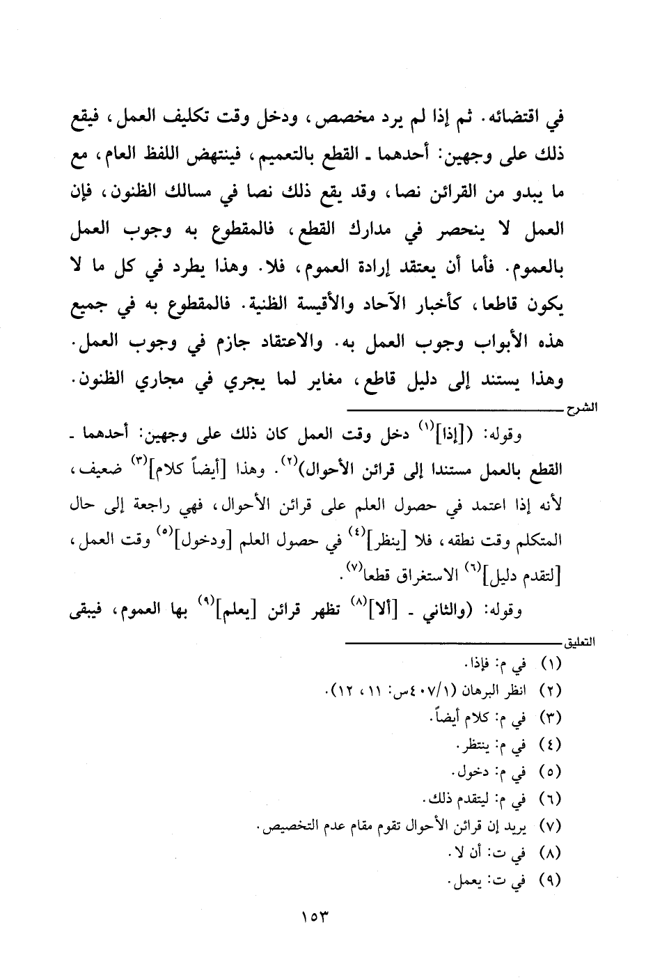 وقوله: ([إذا] دخل وقت العمل كان ذلك على وجهين: أحدهما- القطع بالعمل مستندا إلى قرائن الأحوال). وهذا [أيضًا كلام] ضعيف، لأنه إذا اعتمد في حصول العلم على قرائن الأحوال، فهي راجعة إلى حال المتكلم وقت نطقه، فلا [ينظر] في حصول العلم [ودخول] وقت العمل، [لتقديم دليل] الاستغراق قطعا.