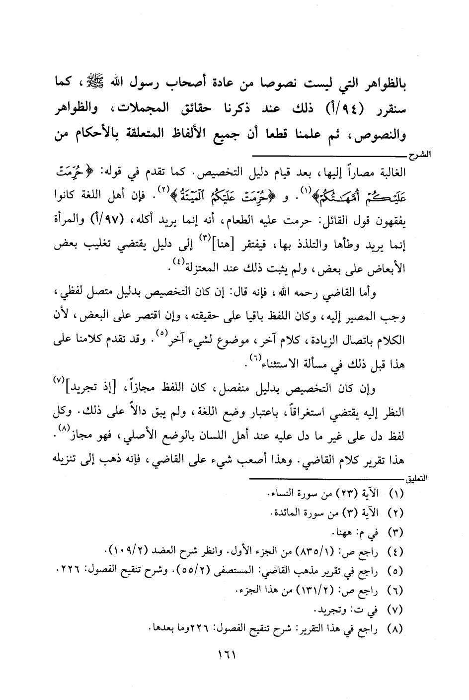 الغالبة مصارًا إليها، بعد قيام دليل التخصيص. كما تقدم في قوله: {حرمت عليكم أمهاتكم}. و} حرمت عليكم الميتة}. فإن أهل اللغة كانوا يفقهون قول القائل: حرمت عليه الطعام، أنه إنما يريد أكله، (٩٧/أ) والمرأة إنما يريد وطأها والتلذذ بها، فيفتقر [هنا] إلى دليل يقتضي تغليب بعض الأبعاض على بعض، ولم يثبت ذلك عند المعتزلة.